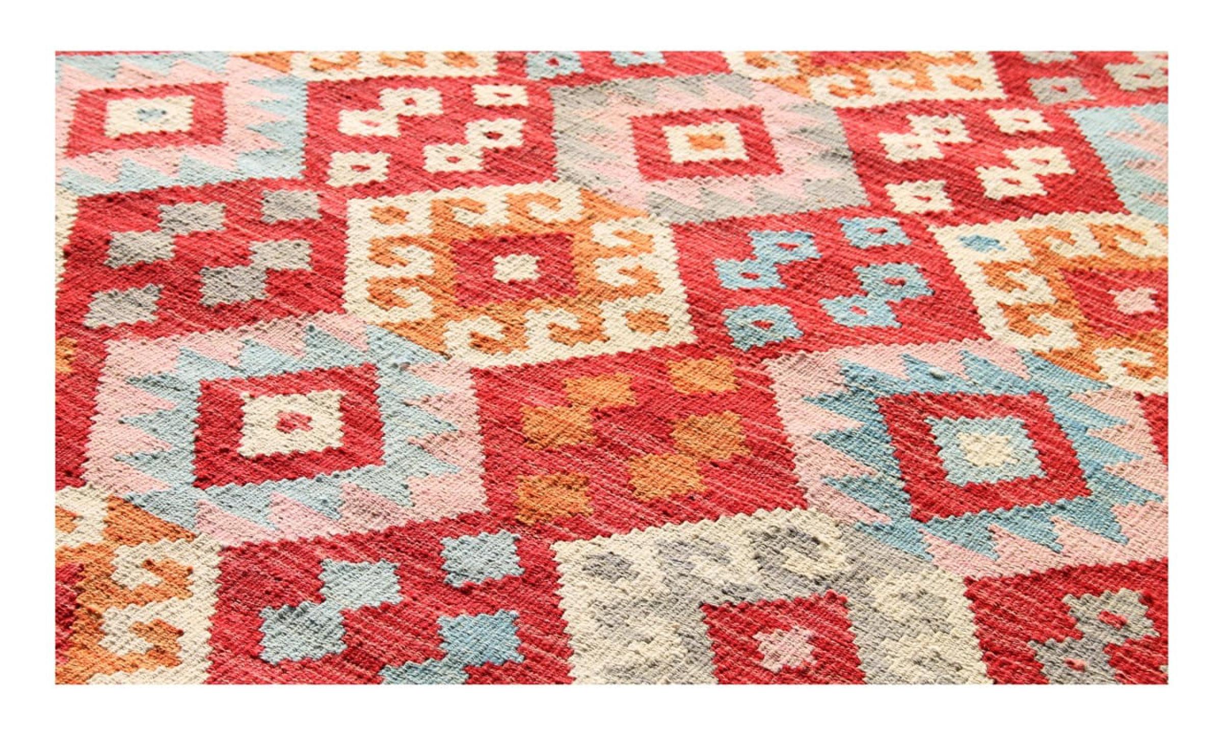 These Kilim rugs have a significant difference from hand-knotted rugs—they are handwoven. As a result, they do not have a high pile of wool and are often flatter and rougher than knotted wool rugs. Their construction is less intricate, making them generally much more affordable. Additionally, Kilim rugs are much lighter and can be laid out on either side. Handwoven Kilims originally come from what was once Persia and are now also widely produced in Afghanistan. They typically feature simple, straight-line patterns, which are characteristic of their weaving technique.