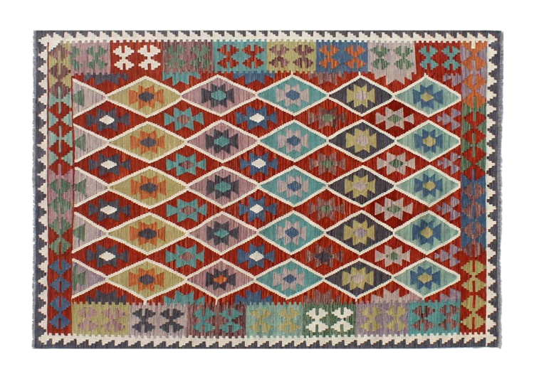 These Kilim rugs have a significant difference from hand-knotted rugs—they are handwoven. As a result, they do not have a high pile of wool and are often flatter and rougher than knotted wool rugs. Their construction is less intricate, making them generally much more affordable. Additionally, Kilim rugs are much lighter and can be laid out on either side. Handwoven Kilims originally come from what was once Persia and are now also widely produced in Afghanistan. They typically feature simple, straight-line patterns, which are characteristic of their weaving technique.