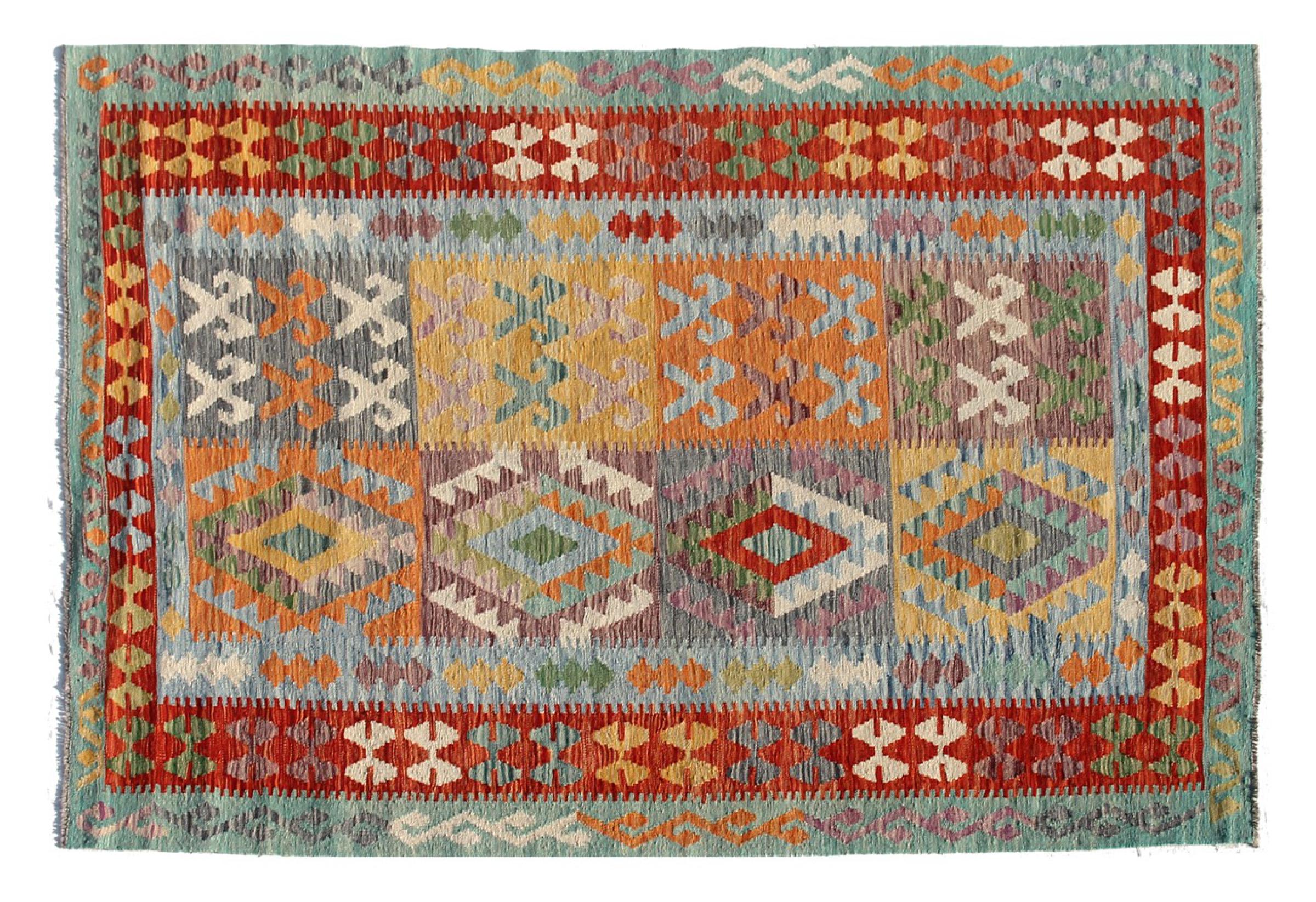 This Kilim Afghan rug has beautiful colors. It is handmade from fine wool. These patterns are traditional design elements that have already been used centuries ago. This particular kilim has been woven by hand in Afghanistan, a country with a long history in weaving and knotting rugs. The rug is robust and can be laid out on both sides.