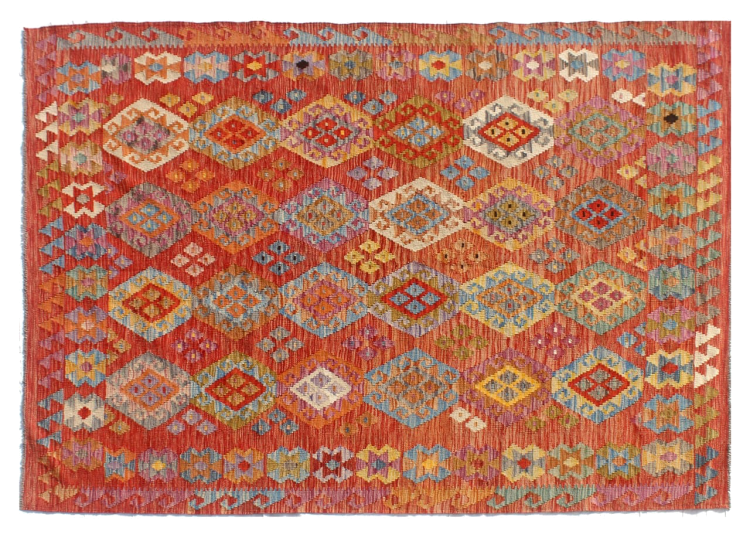 These Kilim rugs have a significant difference from hand-knotted rugs—they are handwoven. As a result, they do not have a high pile of wool and are often flatter and rougher than knotted wool rugs. Their construction is less intricate, making them generally much more affordable. Additionally, Kilim rugs are much lighter and can be laid out on either side. Handwoven Kilims originally come from what was once Persia and are now also widely produced in Afghanistan. They typically feature simple, straight-line patterns, which are characteristic of their weaving technique.
