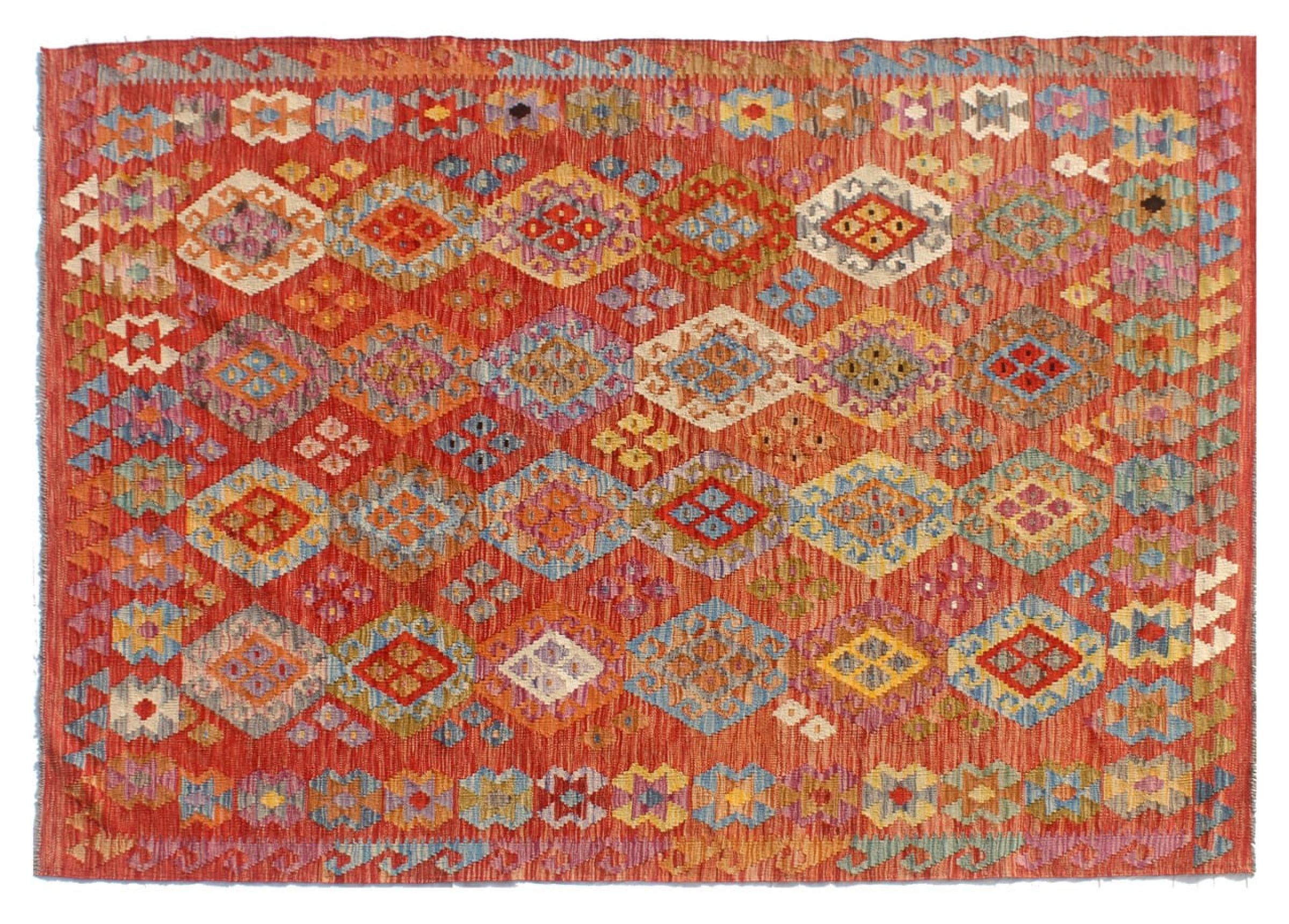 This Kilim Afghan rug has beautiful colors. It is handmade from fine wool. These patterns are traditional design elements that have already been used centuries ago. This particular kilim has been woven by hand in Afghanistan, a country with a long history in weaving and knotting rugs. The rug is robust and can be laid out on both sides.