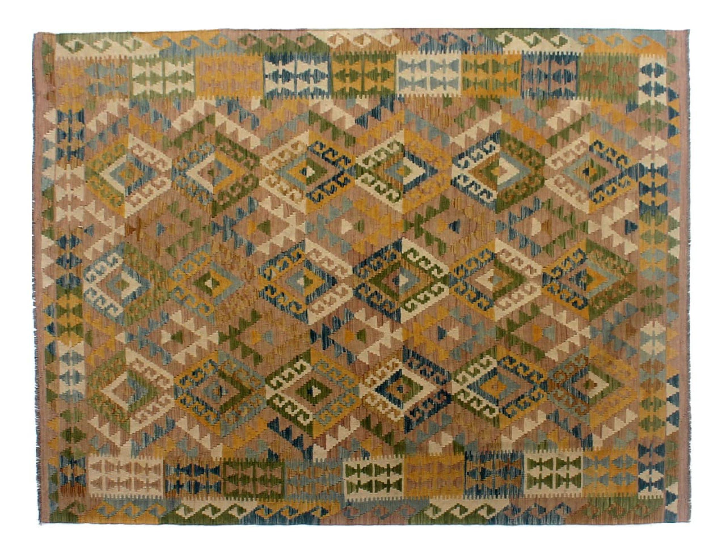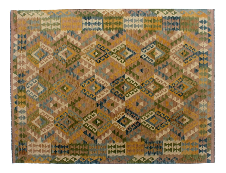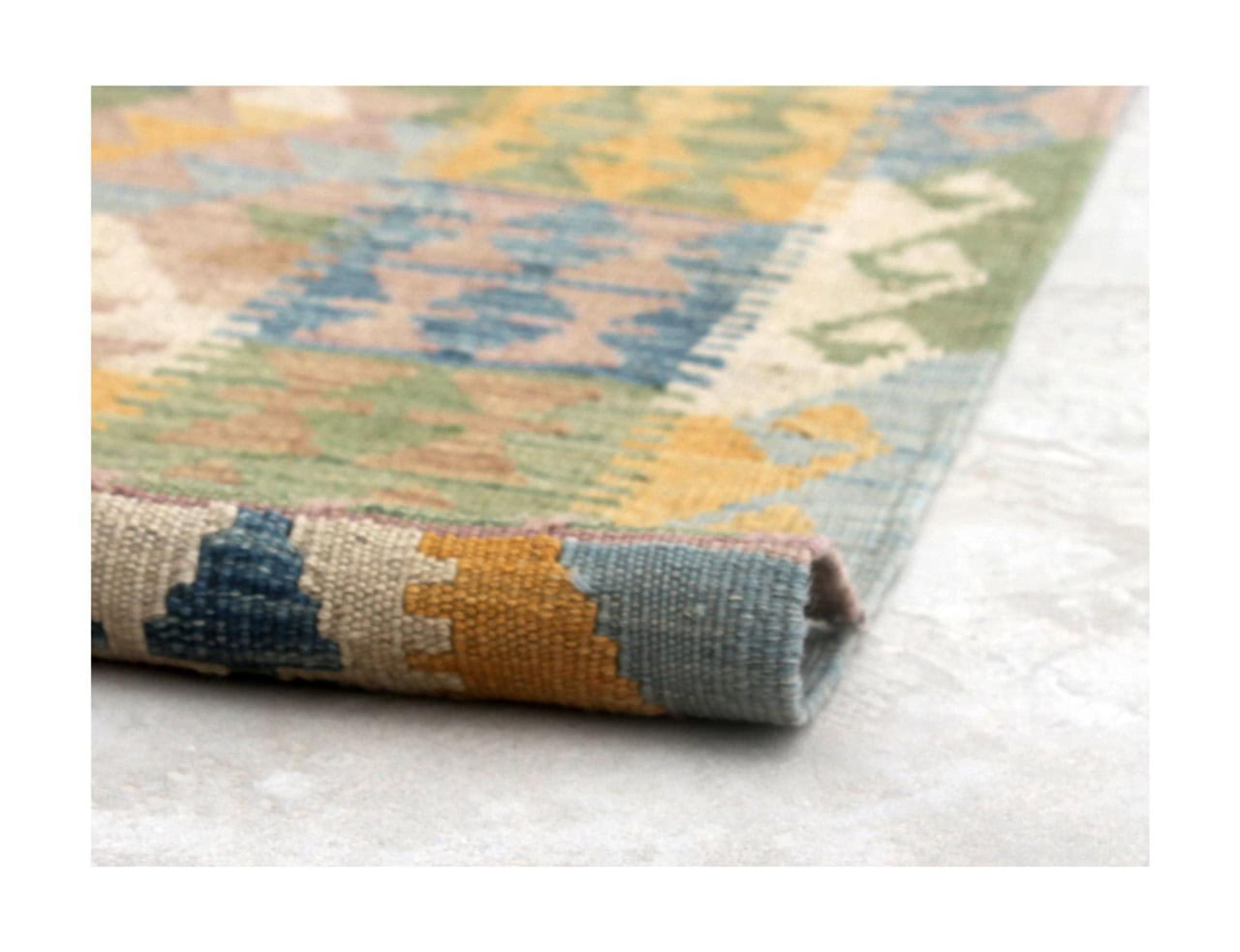 These Kilim rugs have a significant difference from hand-knotted rugs—they are handwoven. As a result, they do not have a high pile of wool and are often flatter and rougher than knotted wool rugs. Their construction is less intricate, making them generally much more affordable. Additionally, Kilim rugs are much lighter and can be laid out on either side. Handwoven Kilims originally come from what was once Persia and are now also widely produced in Afghanistan. They typically feature simple, straight-line patterns, which are characteristic of their weaving technique.