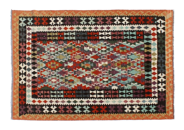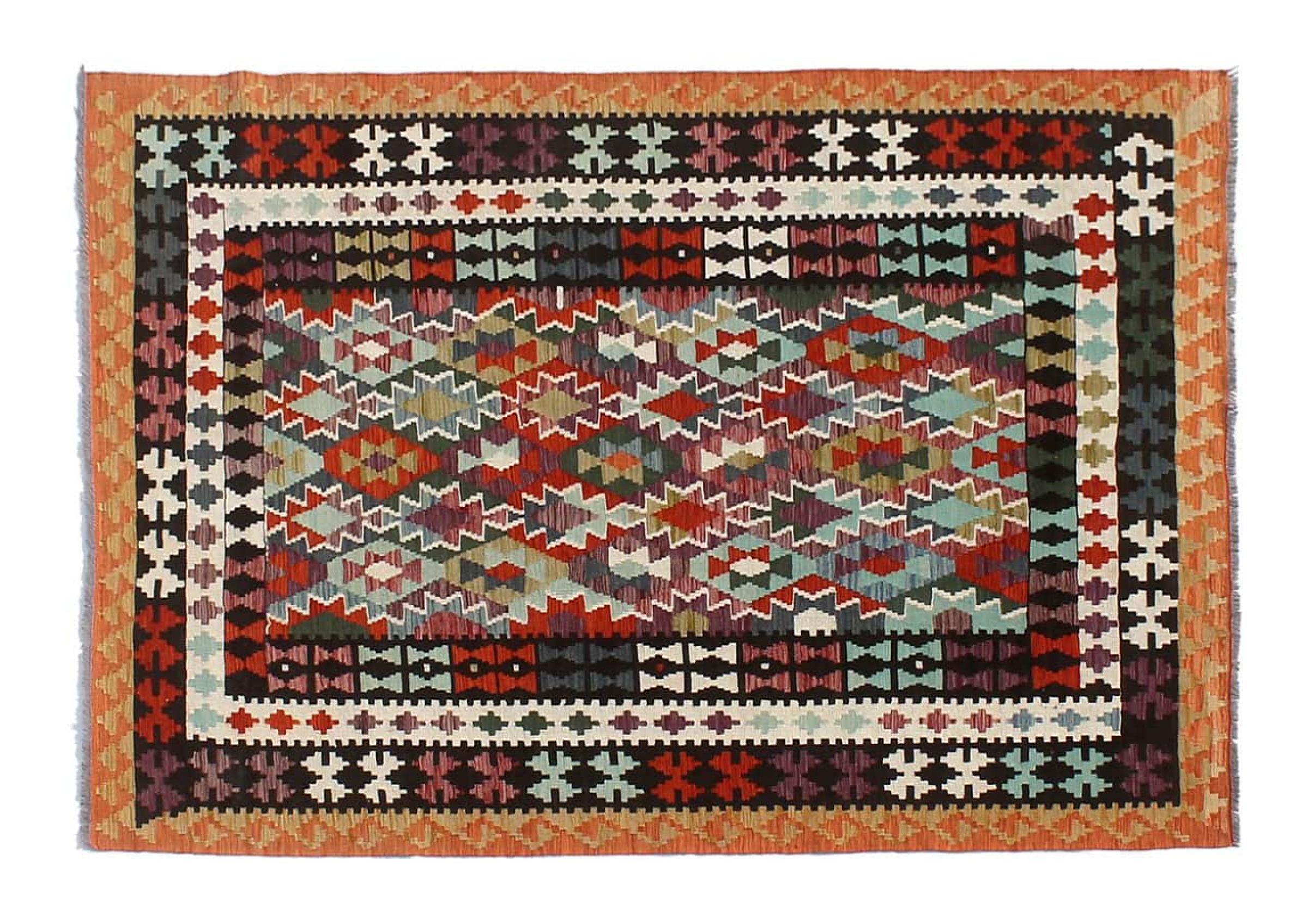 This Kilim Afghan rug has beautiful colors. It is handmade from fine wool. These patterns are traditional design elements that have already been used centuries ago. This particular kilim has been woven by hand in Afghanistan, a country with a long history in weaving and knotting rugs. The rug is robust and can be laid out on both sides.