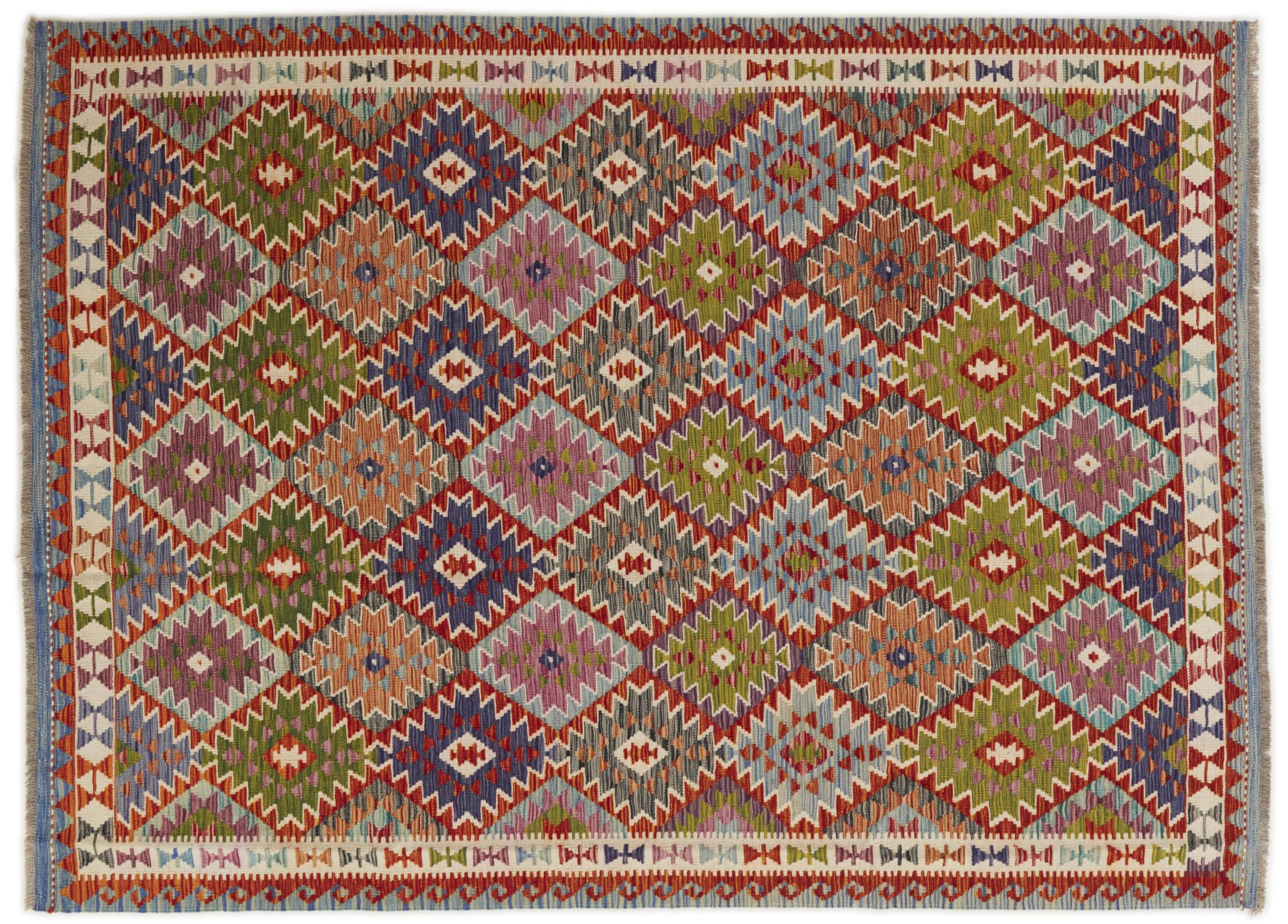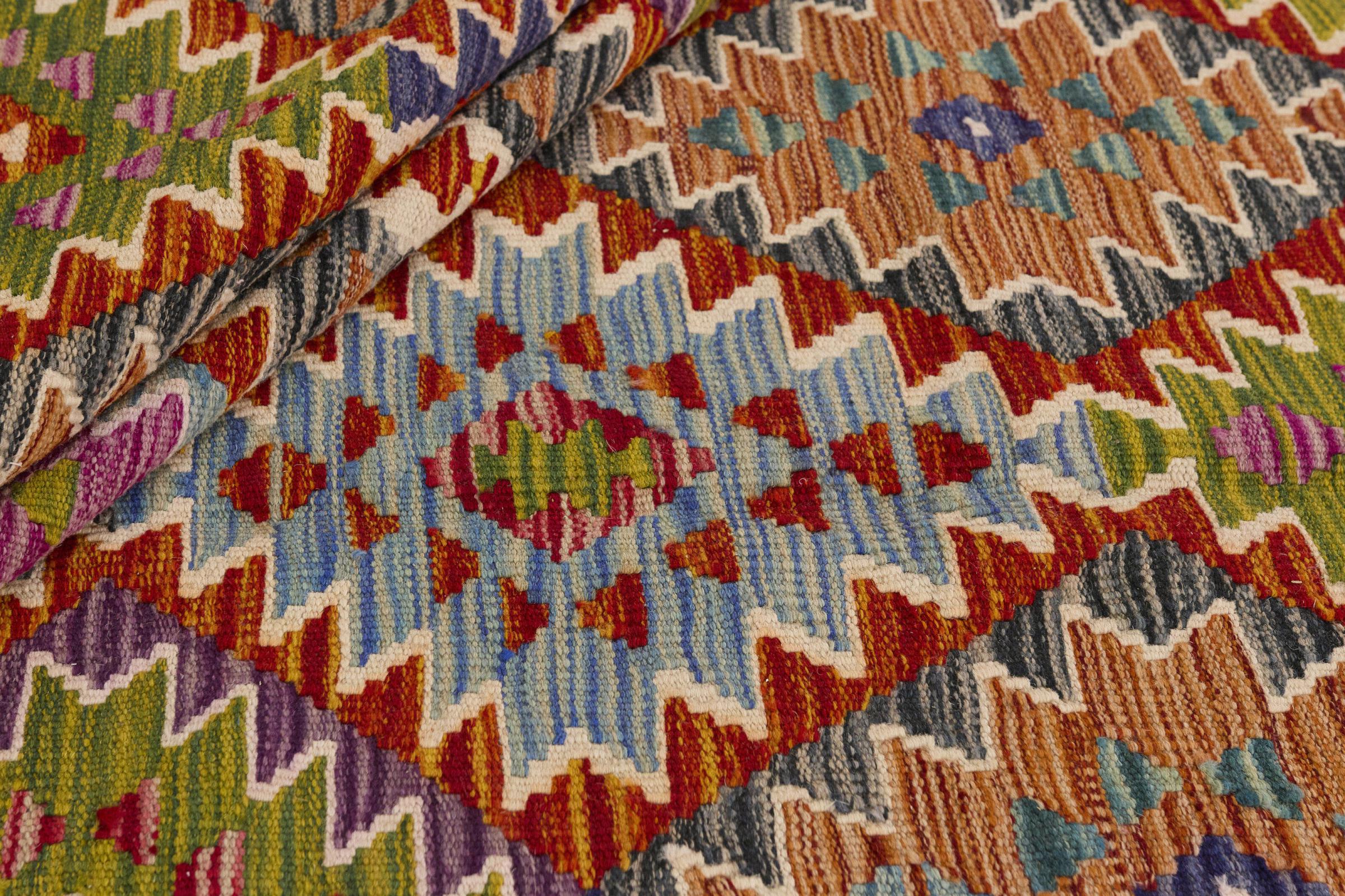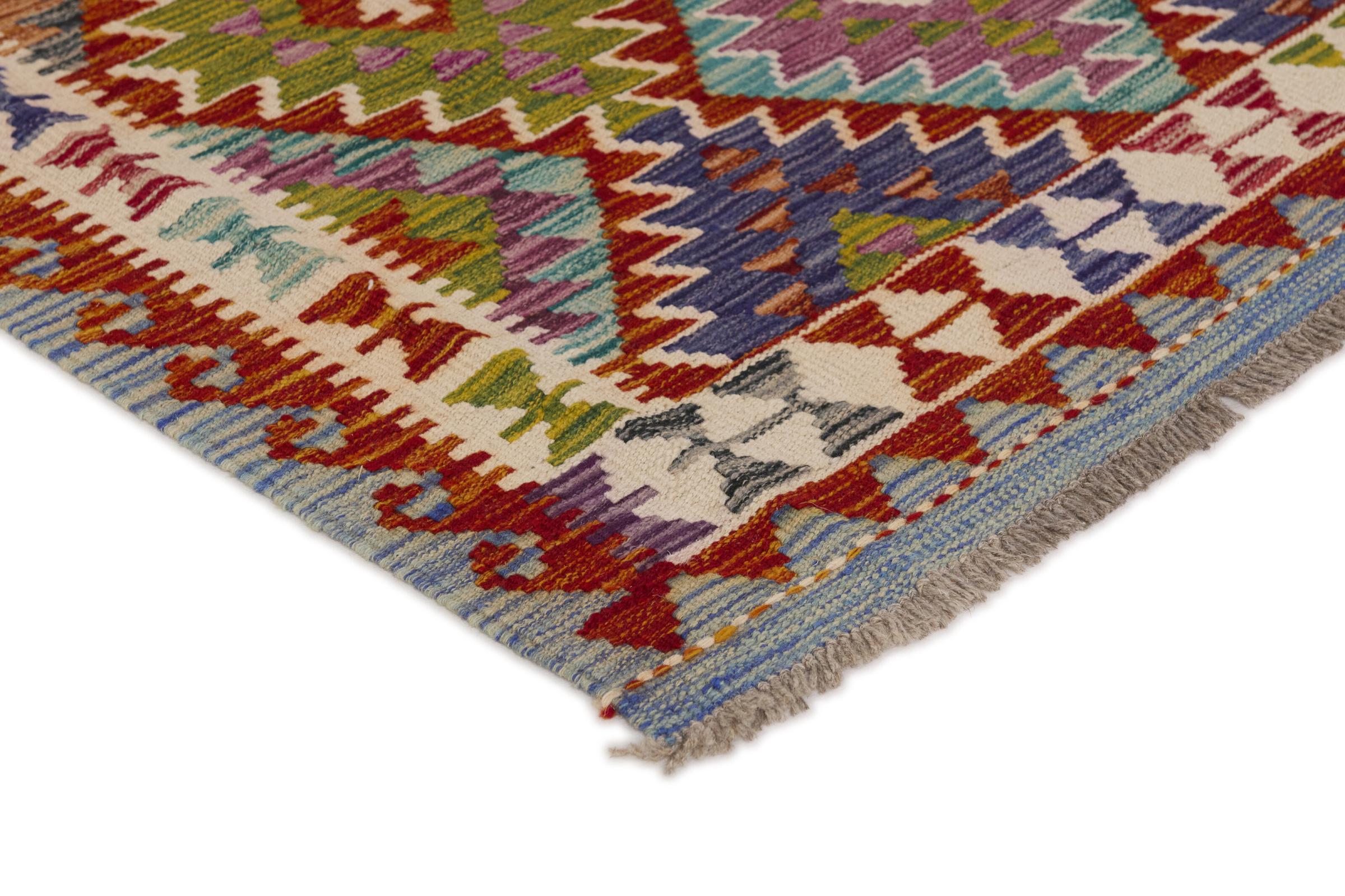 This Kilim Afghan rug has beautiful colors. It is handmade from fine wool. These patterns are traditional design elements that have already been used centuries ago. This particular kilim has been woven by hand in Afghanistan, a country with a long history in weaving and knotting rugs. The rug is robust and can be laid out on both sides.