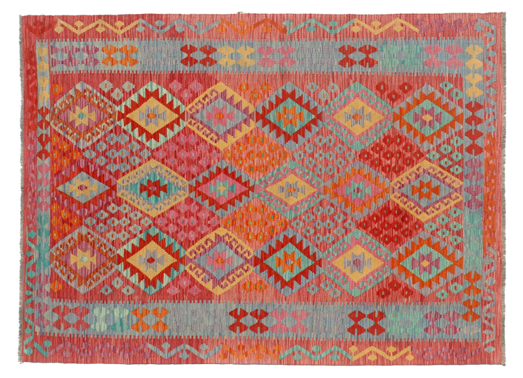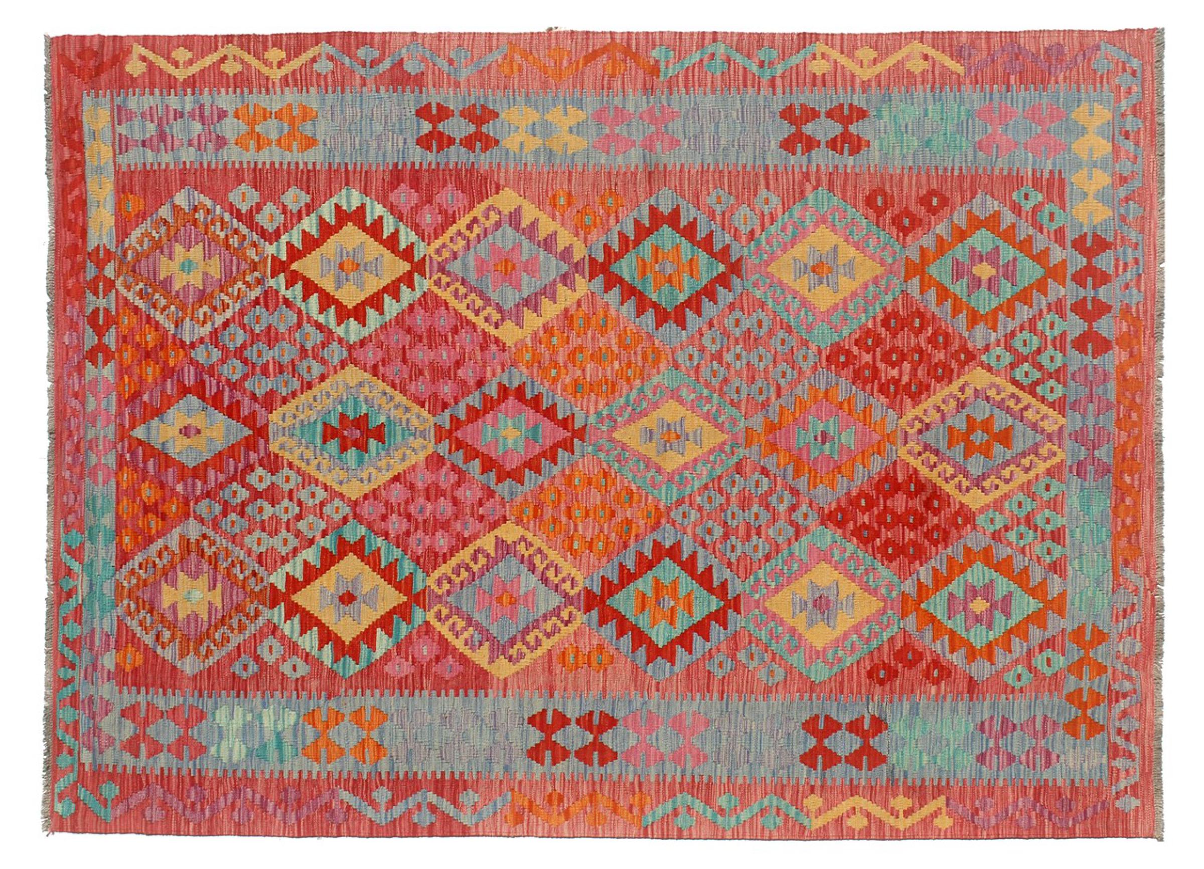 This Kilim Afghan rug has beautiful colors. It is handmade from fine wool. These patterns are traditional design elements that have already been used centuries ago. This particular kilim has been woven by hand in Afghanistan, a country with a long history in weaving and knotting rugs. The rug is robust and can be laid out on both sides.