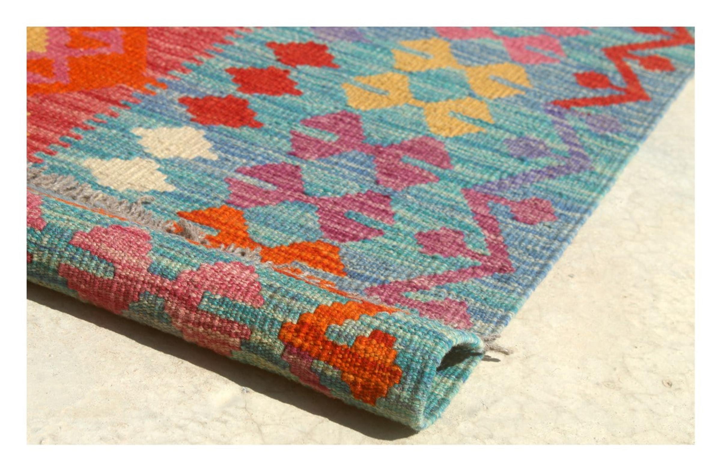 This Kilim Afghan rug has beautiful colors. It is handmade from fine wool. These patterns are traditional design elements that have already been used centuries ago. This particular kilim has been woven by hand in Afghanistan, a country with a long history in weaving and knotting rugs. The rug is robust and can be laid out on both sides.