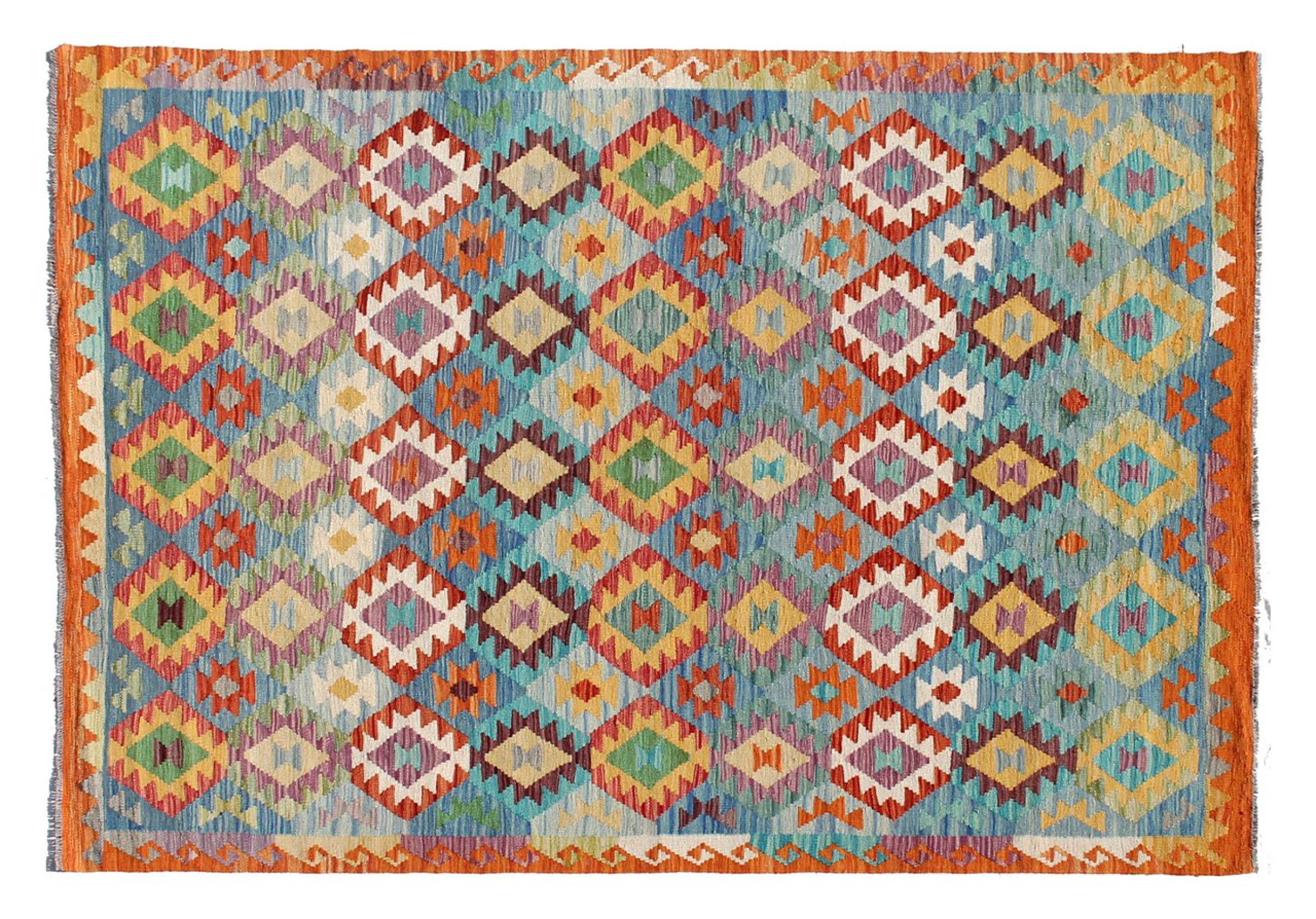 This Kilim Afghan rug has beautiful colors. It is handmade from fine wool. These patterns are traditional design elements that have already been used centuries ago. This particular kilim has been woven by hand in Afghanistan, a country with a long history in weaving and knotting rugs. The rug is robust and can be laid out on both sides.