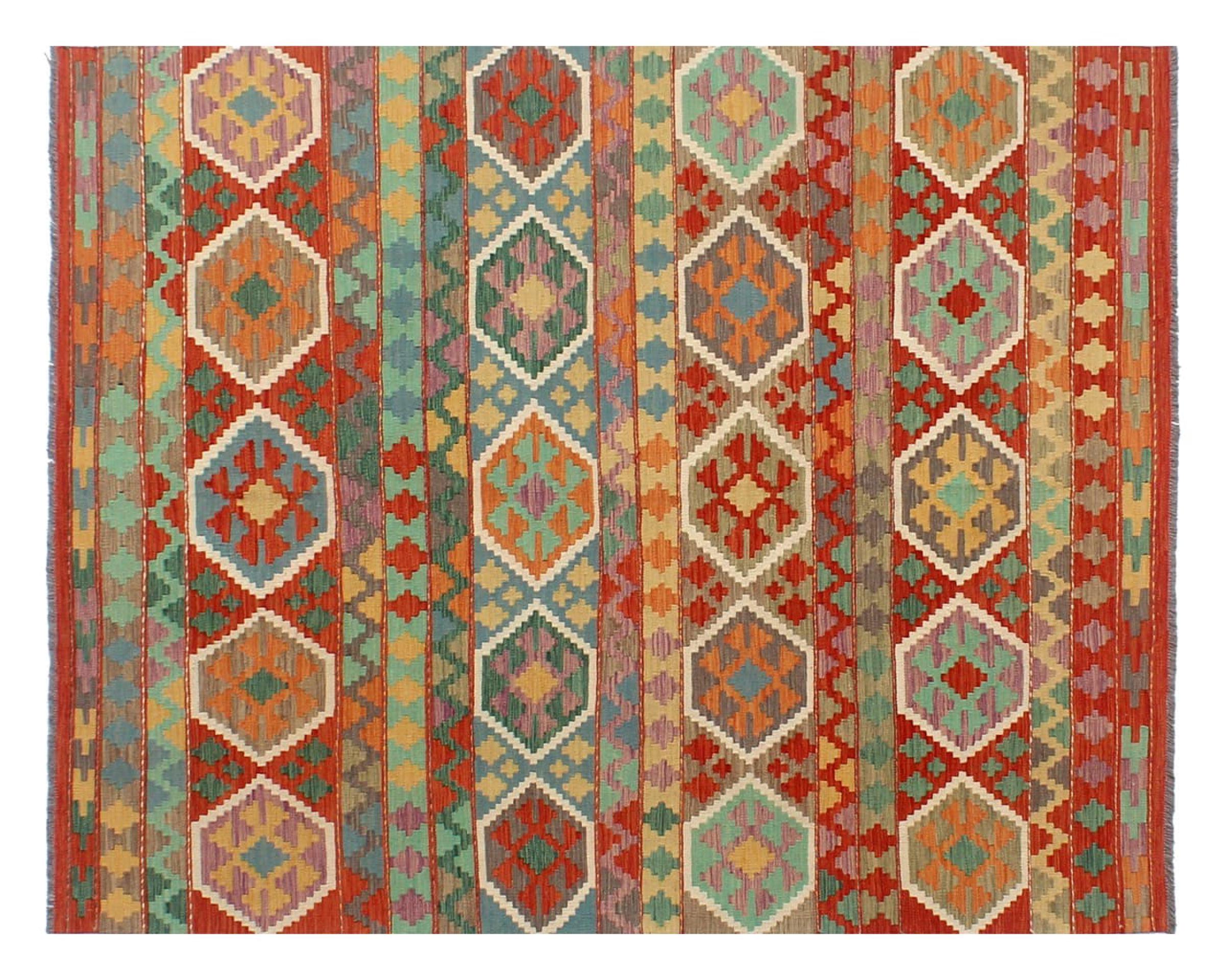 This Kilim Afghan rug has beautiful colors. It is handmade from fine wool. These patterns are traditional design elements that have already been used centuries ago. This particular kilim has been woven by hand in Afghanistan, a country with a long history in weaving and knotting rugs. The rug is robust and can be laid out on both sides.