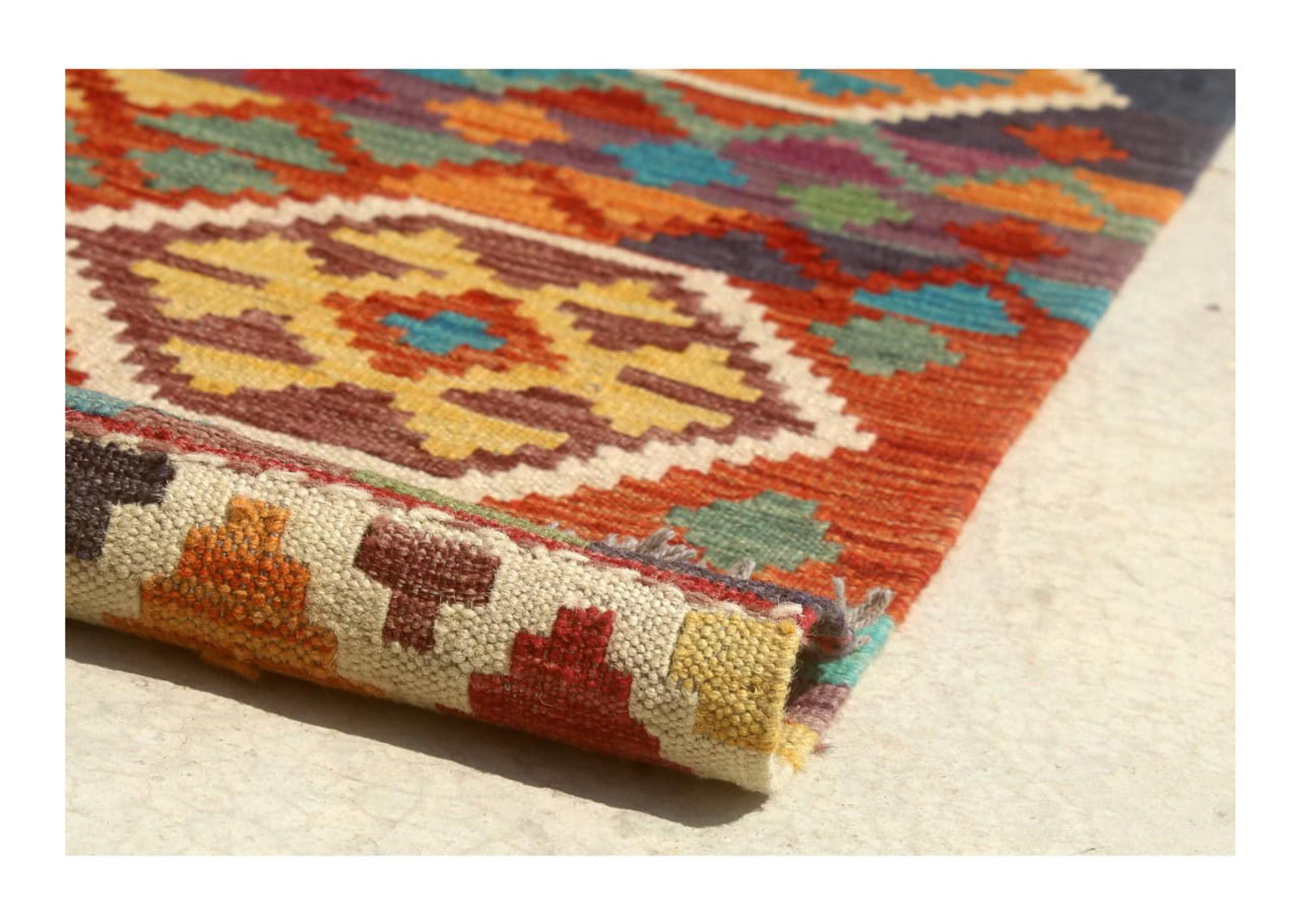 These Kilim rugs have a significant difference from hand-knotted rugs—they are handwoven. As a result, they do not have a high pile of wool and are often flatter and rougher than knotted wool rugs. Their construction is less intricate, making them generally much more affordable. Additionally, Kilim rugs are much lighter and can be laid out on either side. Handwoven Kilims originally come from what was once Persia and are now also widely produced in Afghanistan. They typically feature simple, straight-line patterns, which are characteristic of their weaving technique.