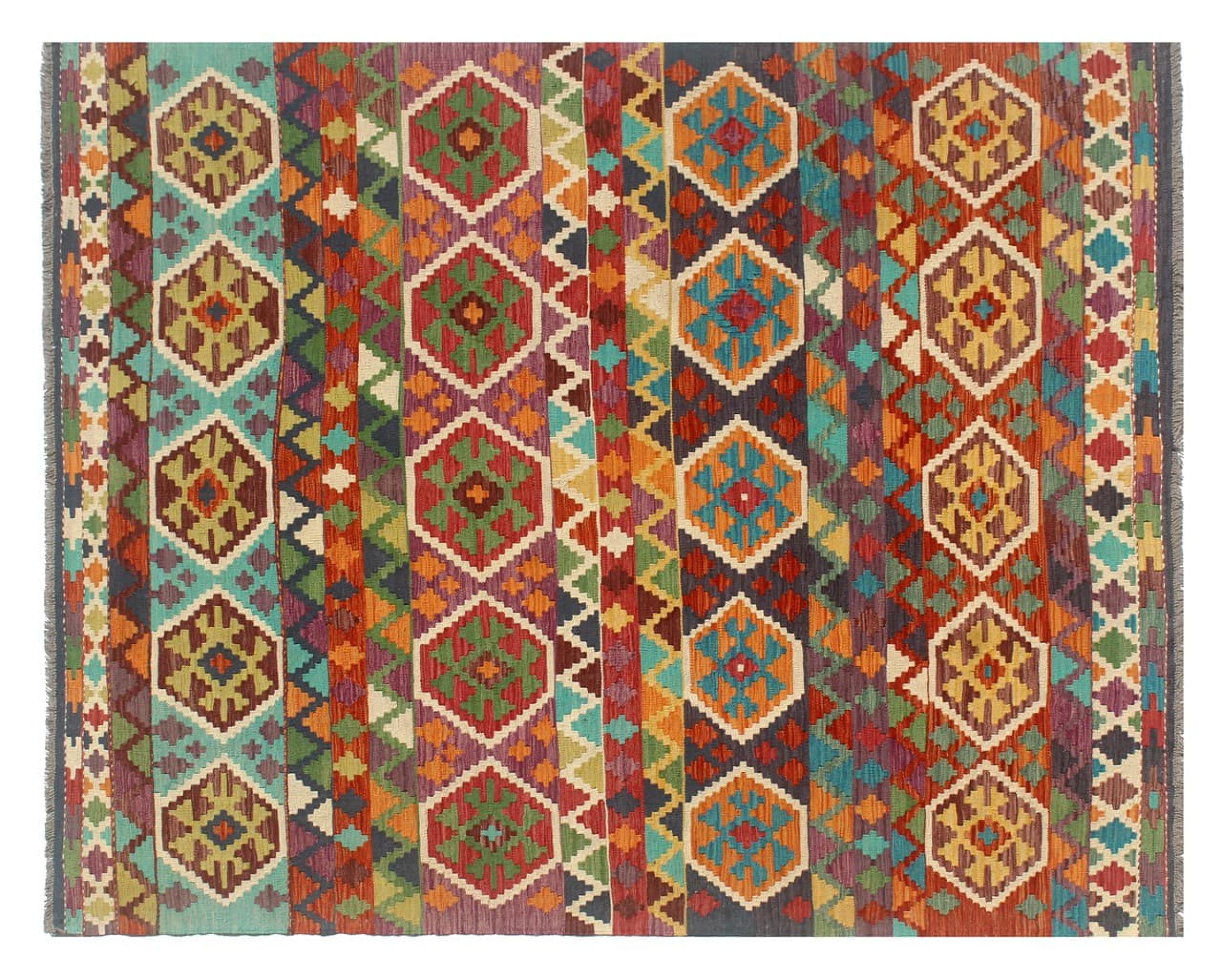 This Kilim Afghan rug has beautiful colors. It is handmade from fine wool. These patterns are traditional design elements that have already been used centuries ago. This particular kilim has been woven by hand in Afghanistan, a country with a long history in weaving and knotting rugs. The rug is robust and can be laid out on both sides.