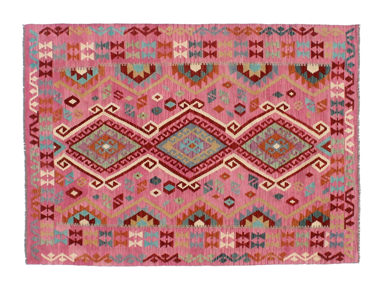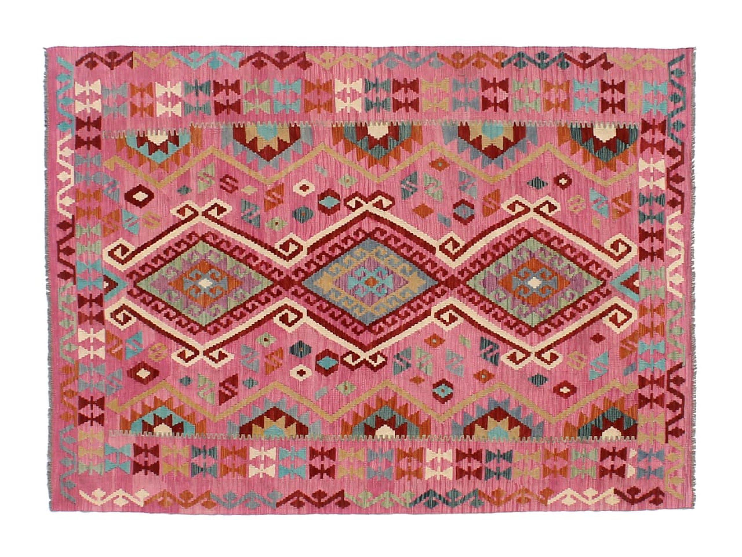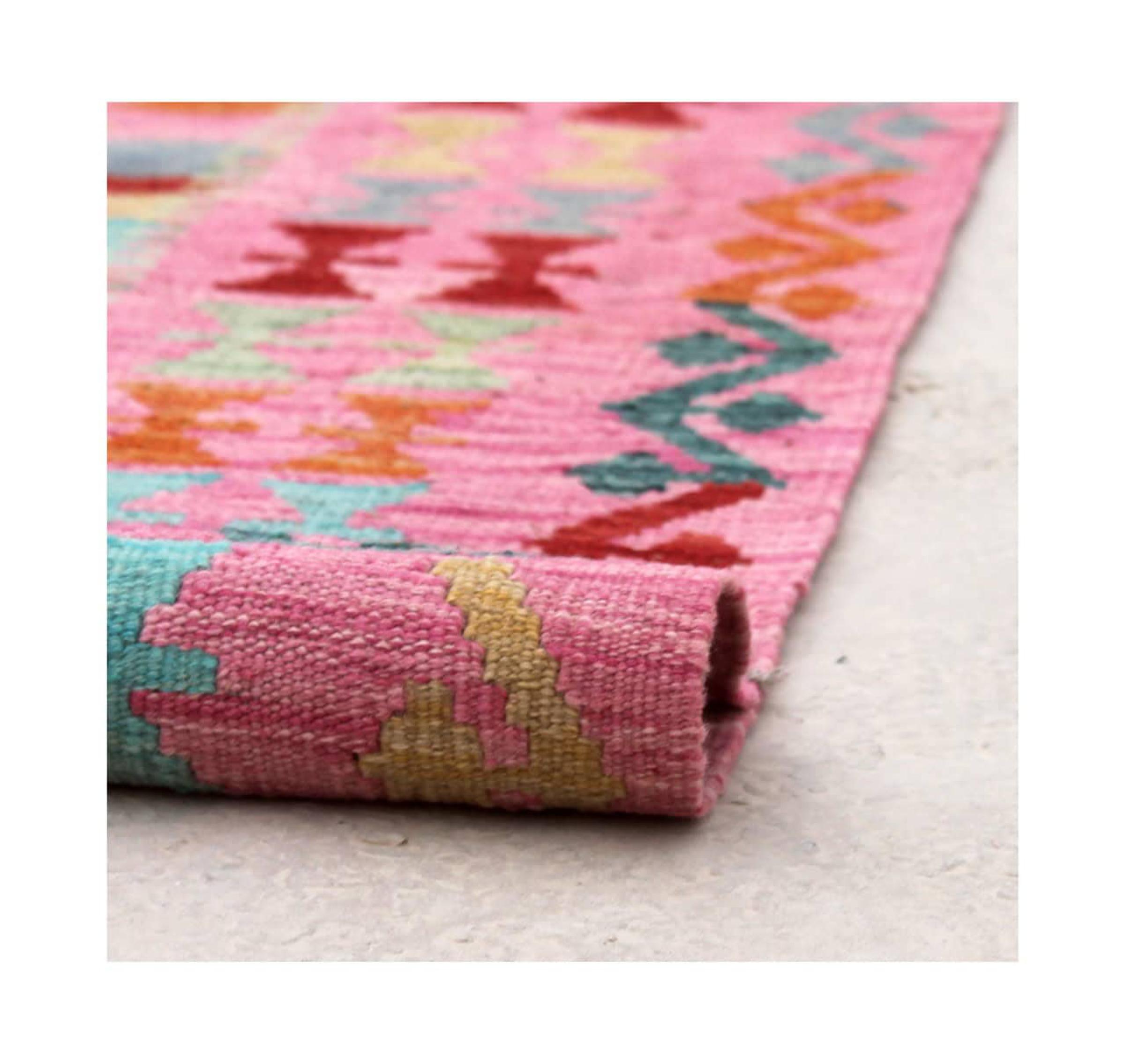 These Kilim rugs have a significant difference from hand-knotted rugs—they are handwoven. As a result, they do not have a high pile of wool and are often flatter and rougher than knotted wool rugs. Their construction is less intricate, making them generally much more affordable. Additionally, Kilim rugs are much lighter and can be laid out on either side. Handwoven Kilims originally come from what was once Persia and are now also widely produced in Afghanistan. They typically feature simple, straight-line patterns, which are characteristic of their weaving technique.