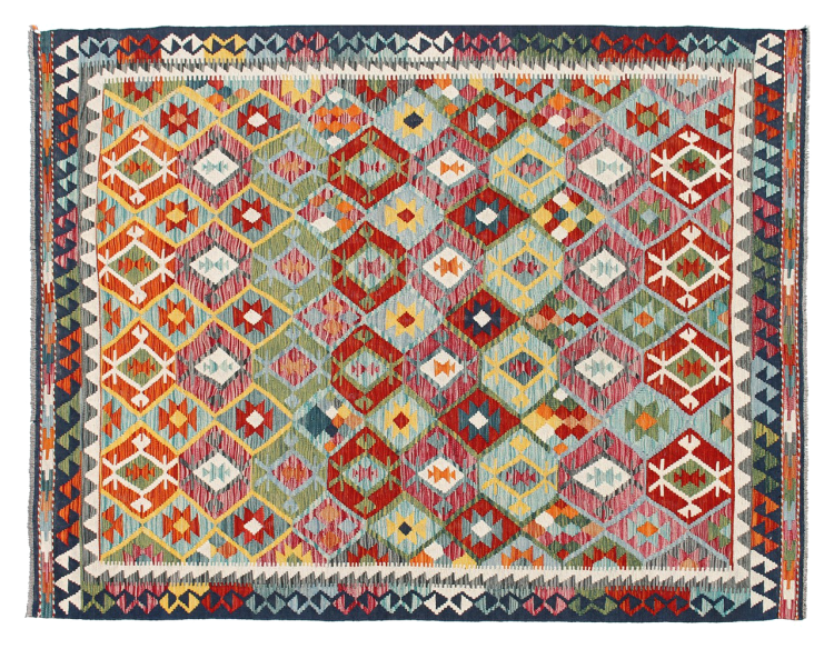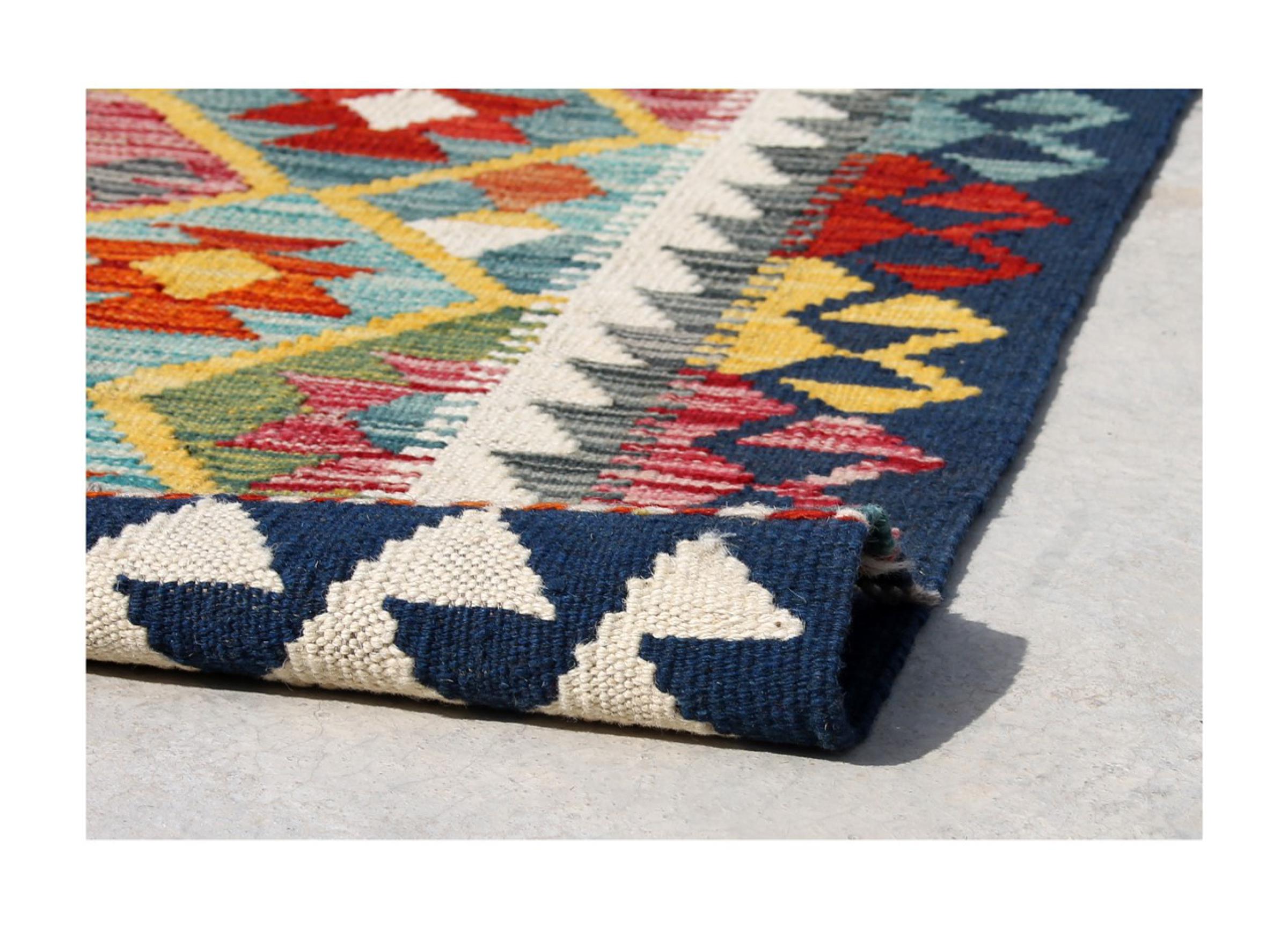 These Kilim rugs have a significant difference from hand-knotted rugs—they are handwoven. As a result, they do not have a high pile of wool and are often flatter and rougher than knotted wool rugs. Their construction is less intricate, making them generally much more affordable. Additionally, Kilim rugs are much lighter and can be laid out on either side. Handwoven Kilims originally come from what was once Persia and are now also widely produced in Afghanistan. They typically feature simple, straight-line patterns, which are characteristic of their weaving technique.