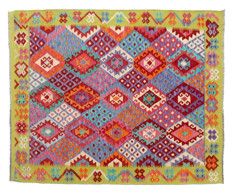 These Kilim rugs have a significant difference from hand-knotted rugs—they are handwoven. As a result, they do not have a high pile of wool and are often flatter and rougher than knotted wool rugs. Their construction is less intricate, making them generally much more affordable. Additionally, Kilim rugs are much lighter and can be laid out on either side. Handwoven Kilims originally come from what was once Persia and are now also widely produced in Afghanistan. They typically feature simple, straight-line patterns, which are characteristic of their weaving technique.