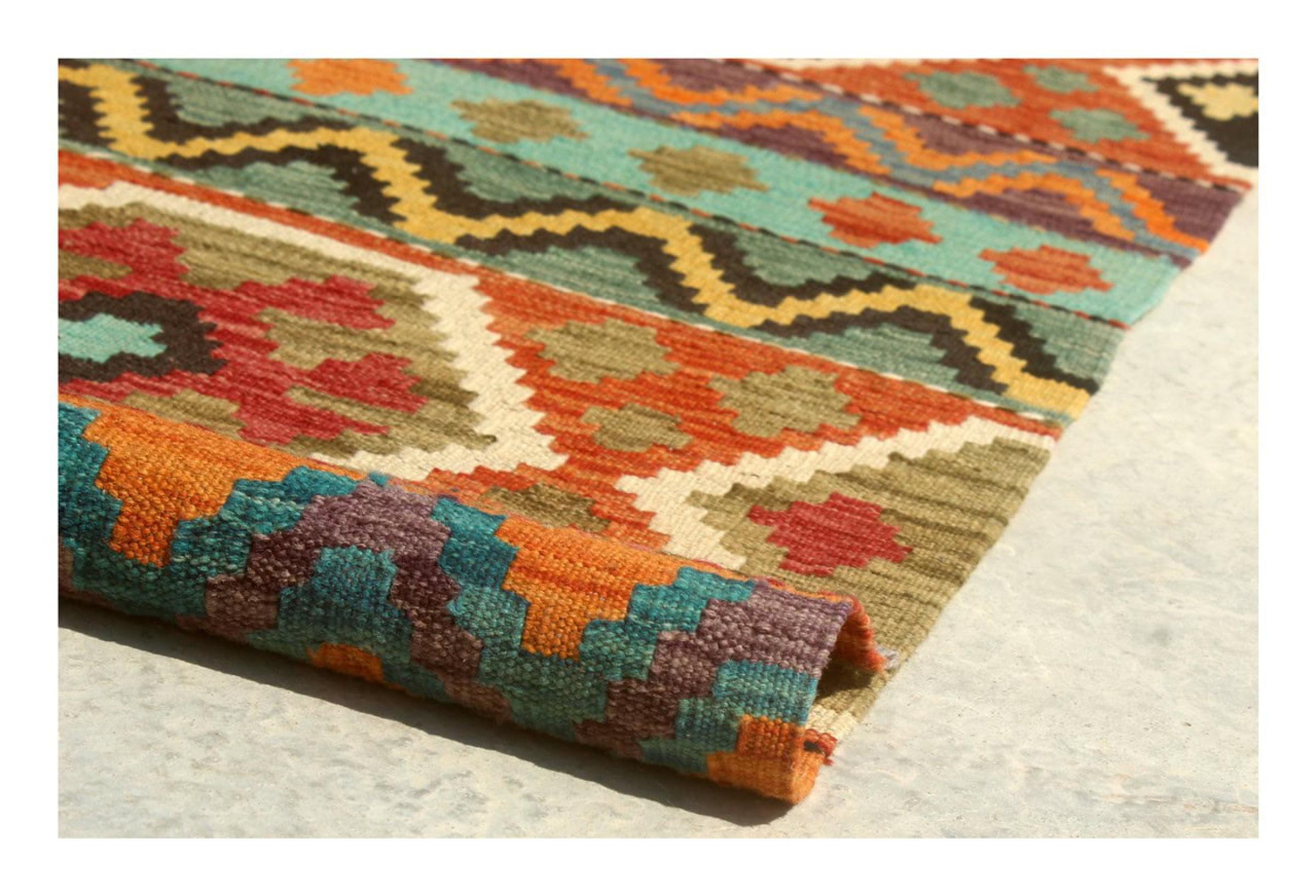 These Kilim rugs have a significant difference from hand-knotted rugs—they are handwoven. As a result, they do not have a high pile of wool and are often flatter and rougher than knotted wool rugs. Their construction is less intricate, making them generally much more affordable. Additionally, Kilim rugs are much lighter and can be laid out on either side. Handwoven Kilims originally come from what was once Persia and are now also widely produced in Afghanistan. They typically feature simple, straight-line patterns, which are characteristic of their weaving technique.