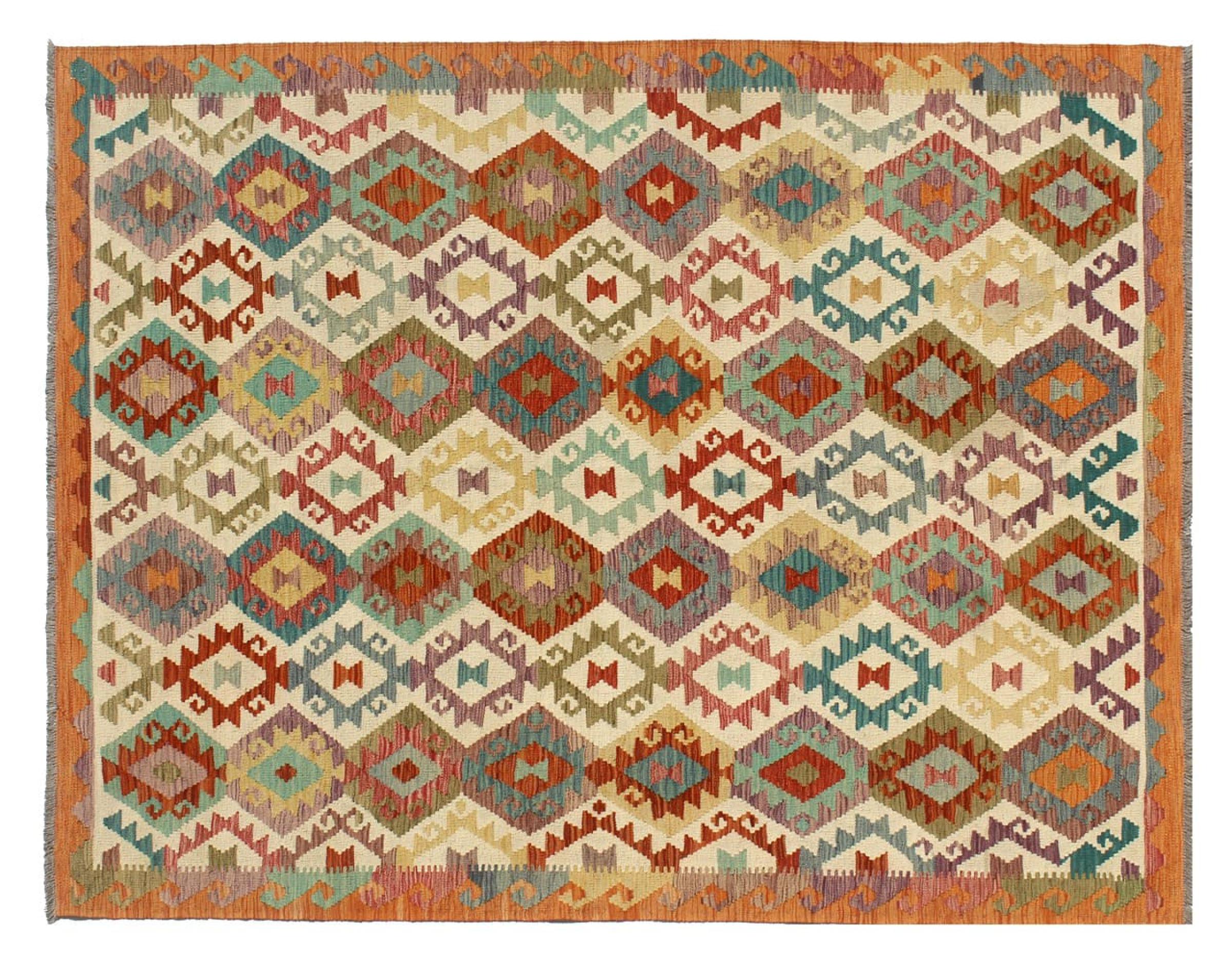 This Kilim Afghan rug has beautiful colors. It is handmade from fine wool. These patterns are traditional design elements that have already been used centuries ago. This particular kilim has been woven by hand in Afghanistan, a country with a long history in weaving and knotting rugs. The rug is robust and can be laid out on both sides.