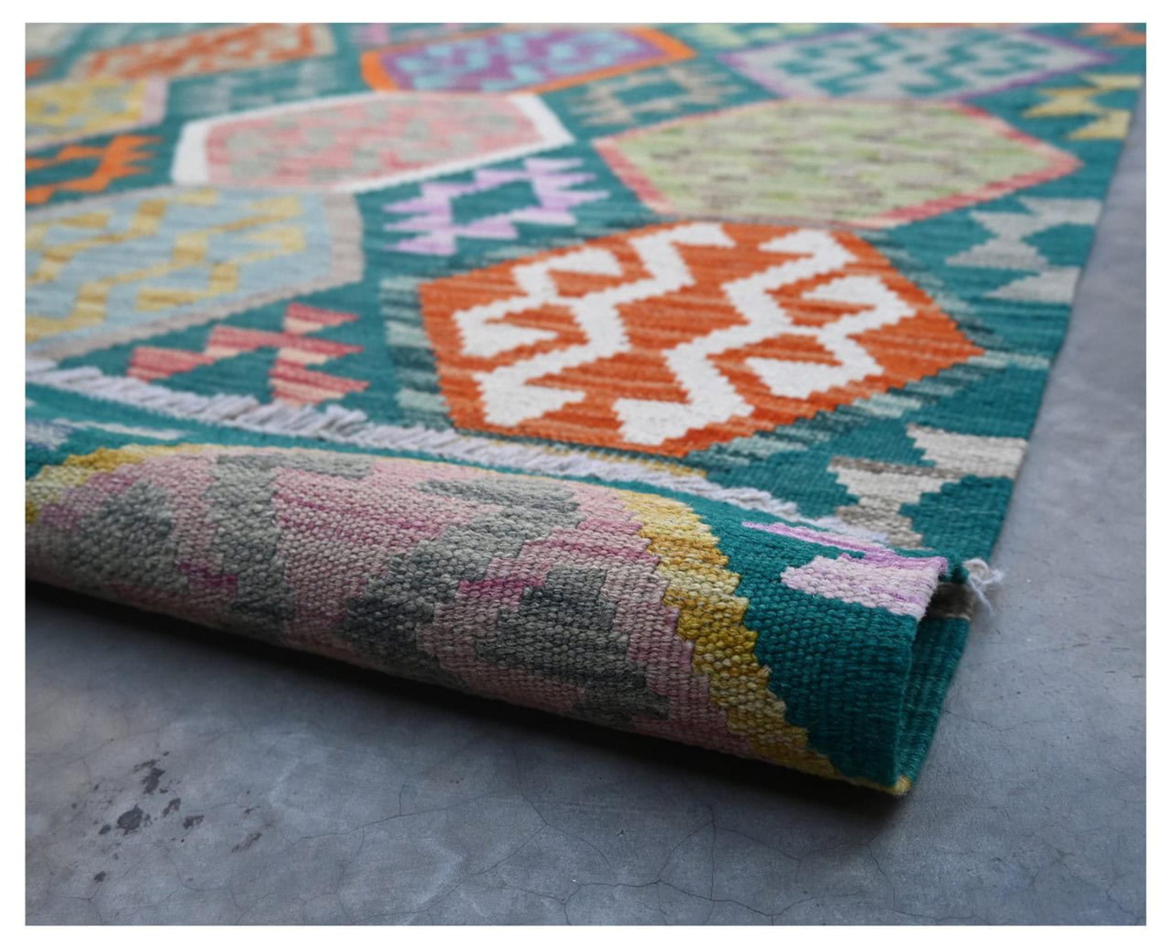 These Kilim rugs have a significant difference from hand-knotted rugs—they are handwoven. As a result, they do not have a high pile of wool and are often flatter and rougher than knotted wool rugs. Their construction is less intricate, making them generally much more affordable. Additionally, Kilim rugs are much lighter and can be laid out on either side. Handwoven Kilims originally come from what was once Persia and are now also widely produced in Afghanistan. They typically feature simple, straight-line patterns, which are characteristic of their weaving technique.
