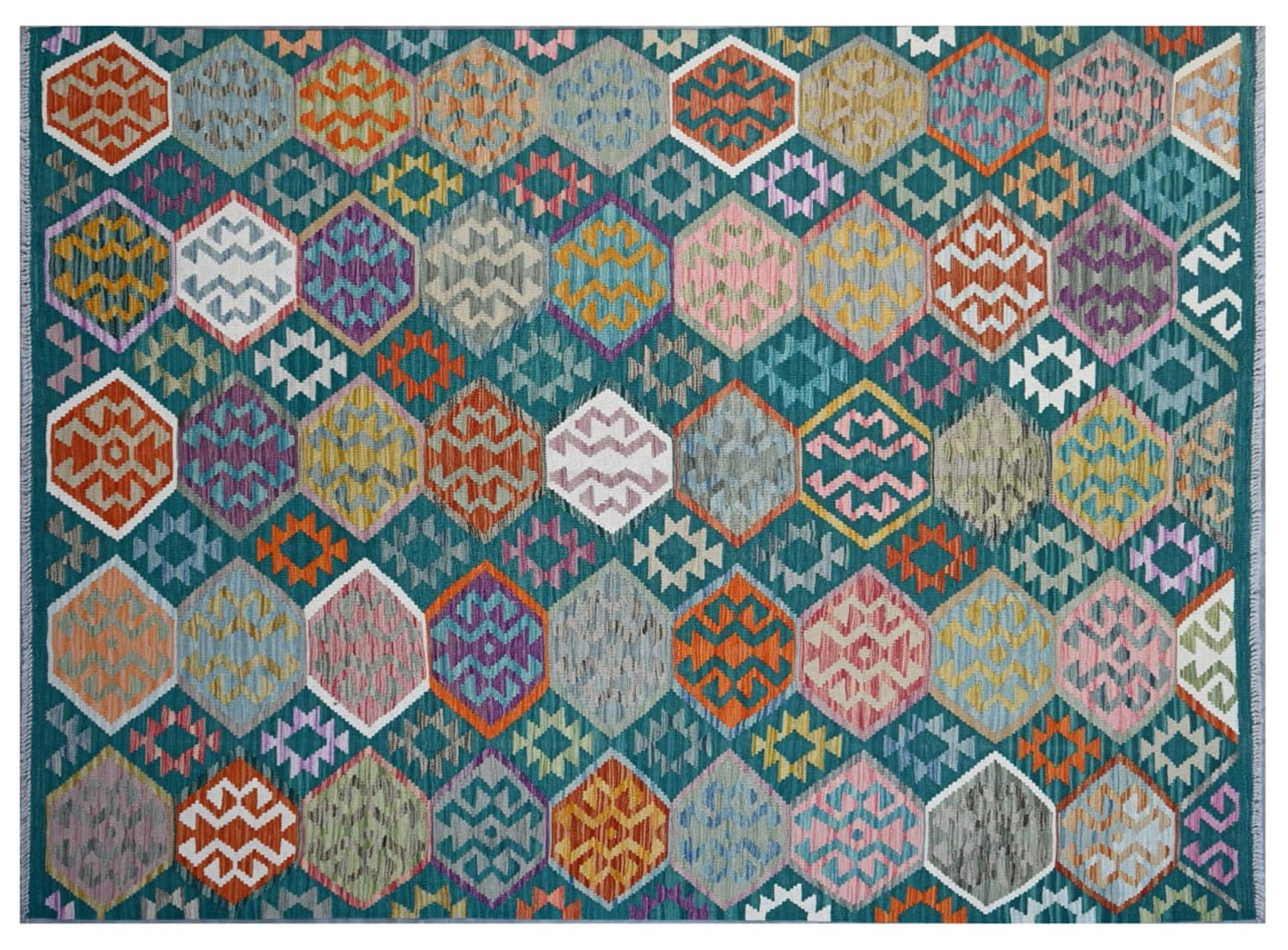 This Kilim Afghan rug has beautiful colors. It is handmade from fine wool. These patterns are traditional design elements that have already been used centuries ago. This particular kilim has been woven by hand in Afghanistan, a country with a long history in weaving and knotting rugs. The rug is robust and can be laid out on both sides.