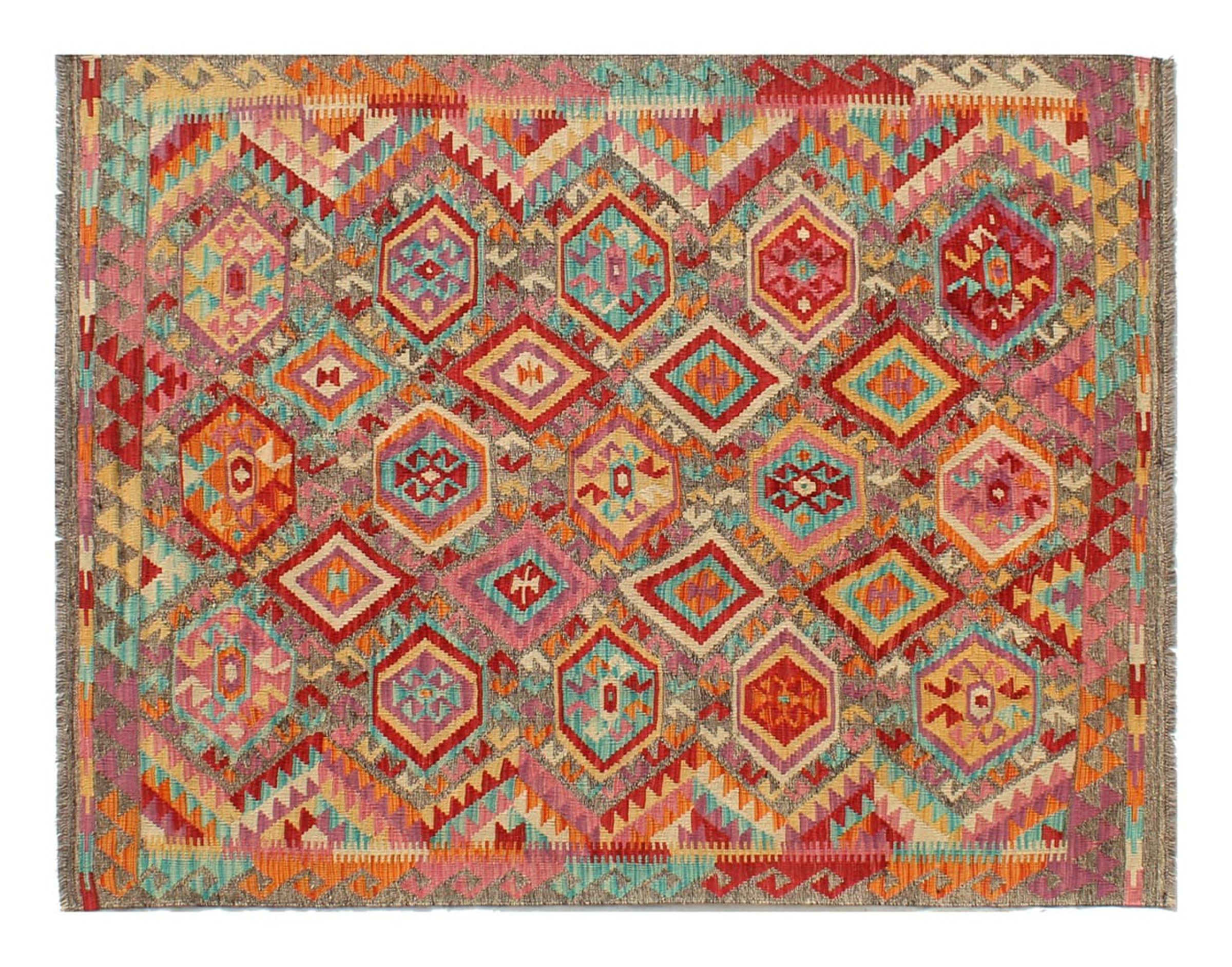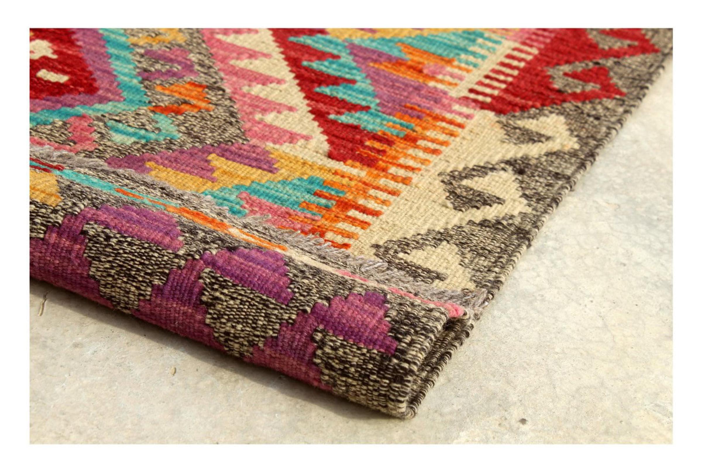 This Kilim Afghan rug has beautiful colors. It is handmade from fine wool. These patterns are traditional design elements that have already been used centuries ago. This particular kilim has been woven by hand in Afghanistan, a country with a long history in weaving and knotting rugs. The rug is robust and can be laid out on both sides.