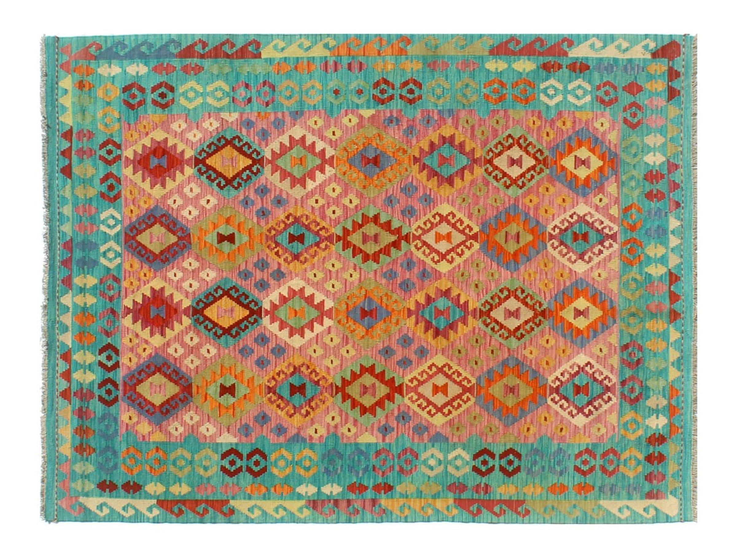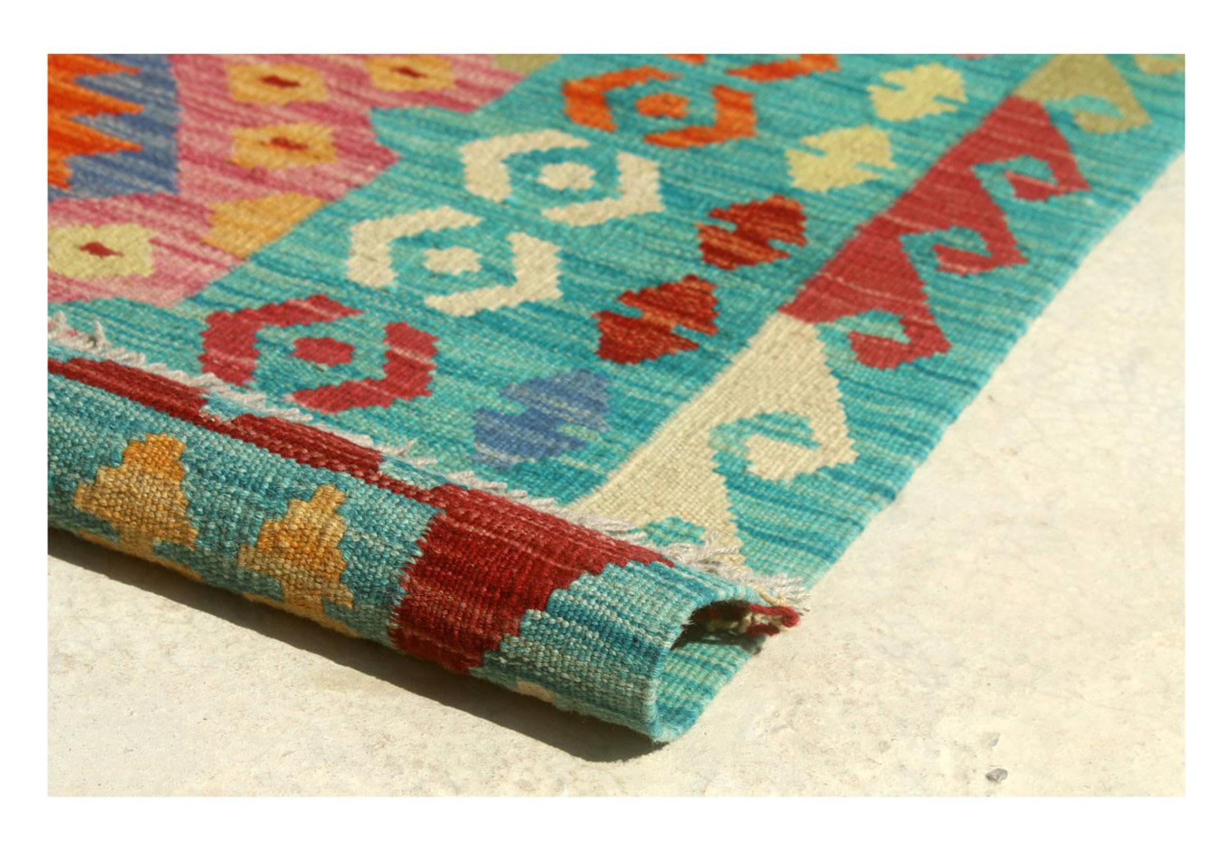This Kilim Afghan rug has beautiful colors. It is handmade from fine wool. These patterns are traditional design elements that have already been used centuries ago. This particular kilim has been woven by hand in Afghanistan, a country with a long history in weaving and knotting rugs. The rug is robust and can be laid out on both sides.