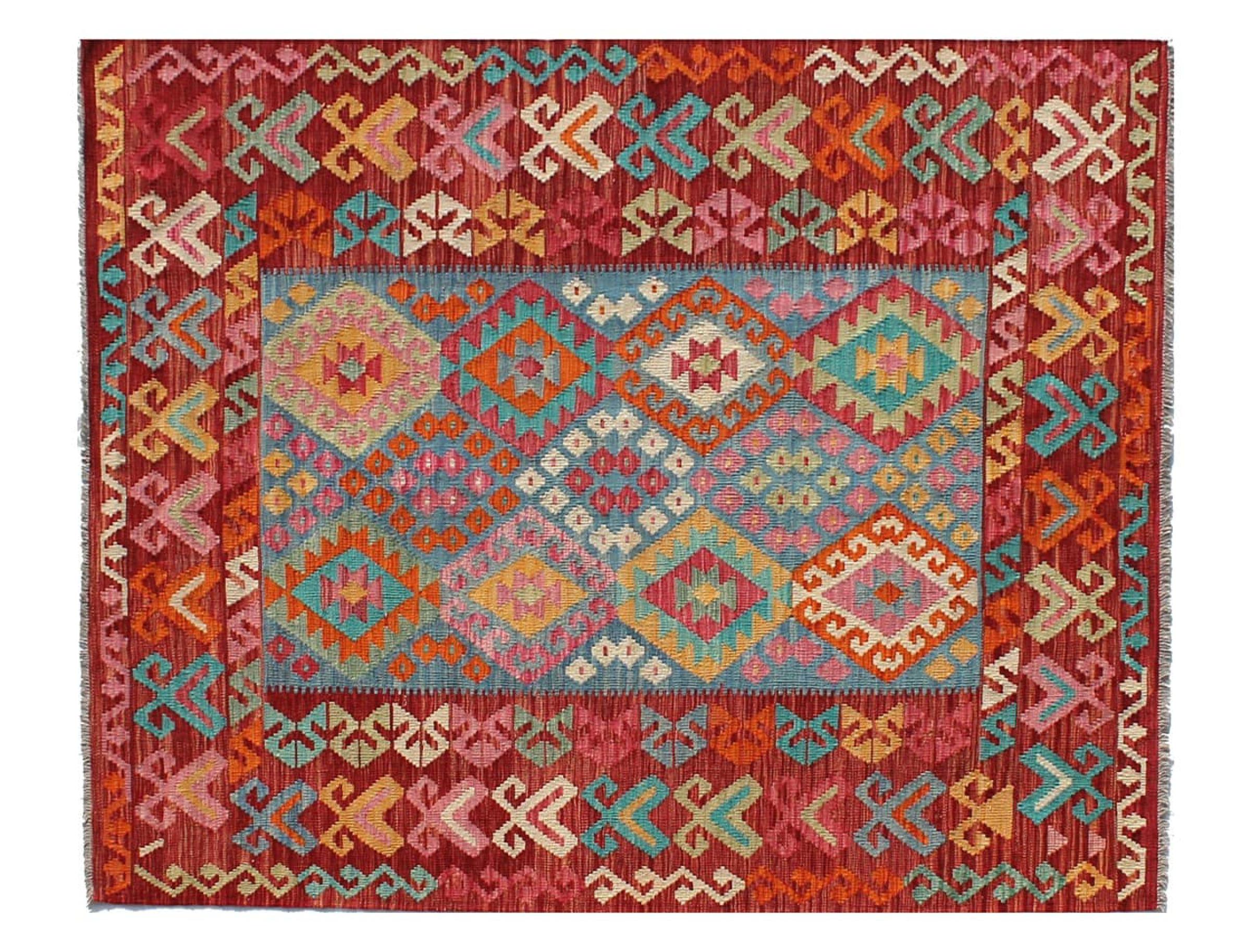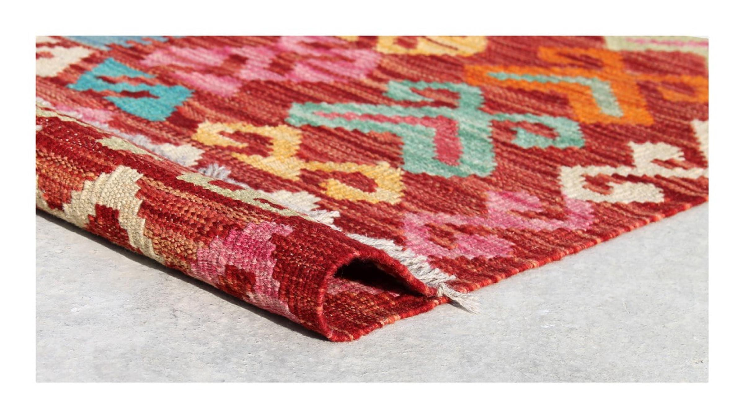 These Kilim rugs have a significant difference from hand-knotted rugs—they are handwoven. As a result, they do not have a high pile of wool and are often flatter and rougher than knotted wool rugs. Their construction is less intricate, making them generally much more affordable. Additionally, Kilim rugs are much lighter and can be laid out on either side. Handwoven Kilims originally come from what was once Persia and are now also widely produced in Afghanistan. They typically feature simple, straight-line patterns, which are characteristic of their weaving technique.