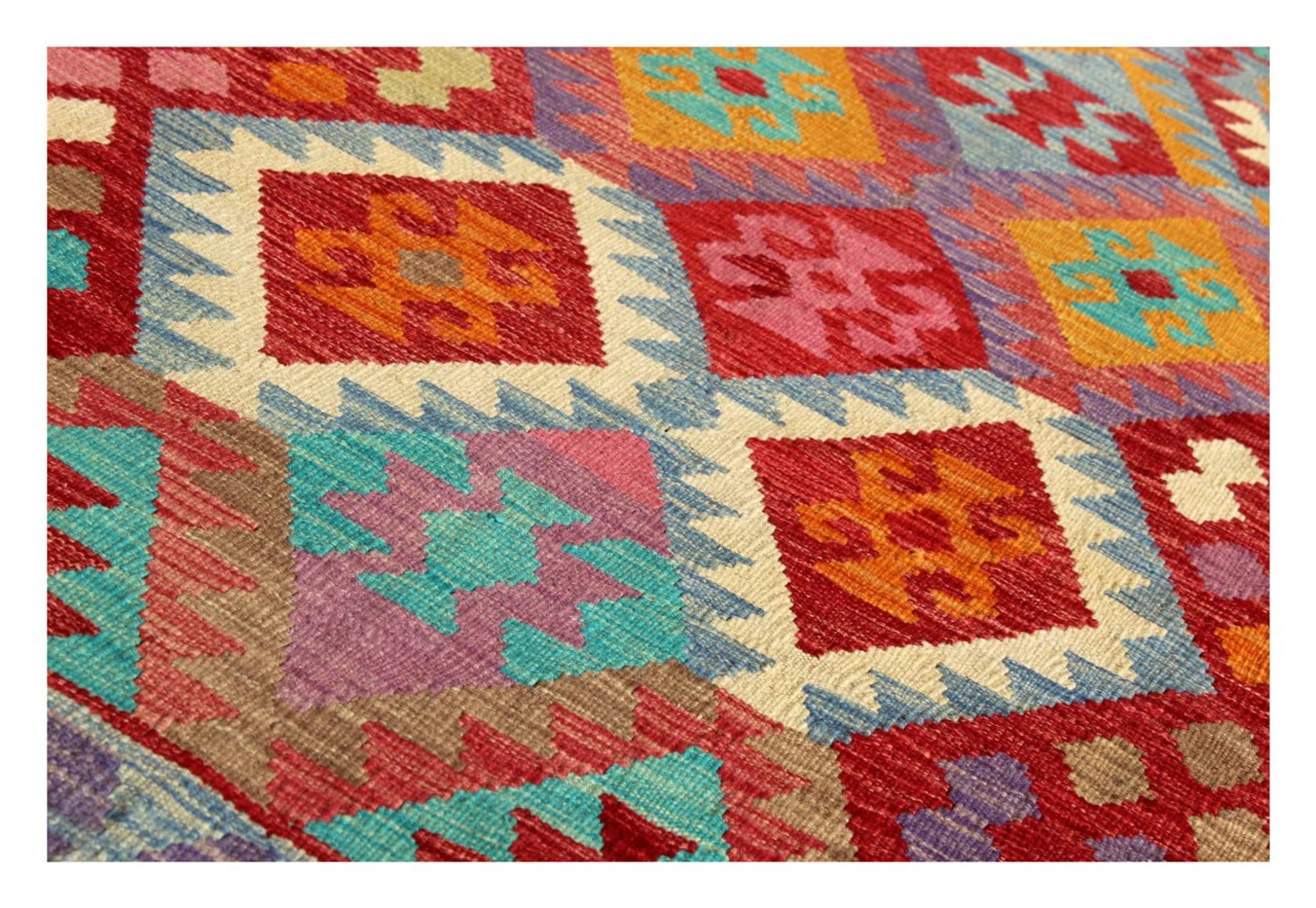 This Kilim Afghan rug has beautiful colors. It is handmade from fine wool. These patterns are traditional design elements that have already been used centuries ago. This particular kilim has been woven by hand in Afghanistan, a country with a long history in weaving and knotting rugs. The rug is robust and can be laid out on both sides.