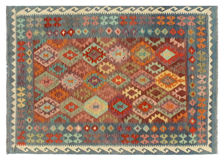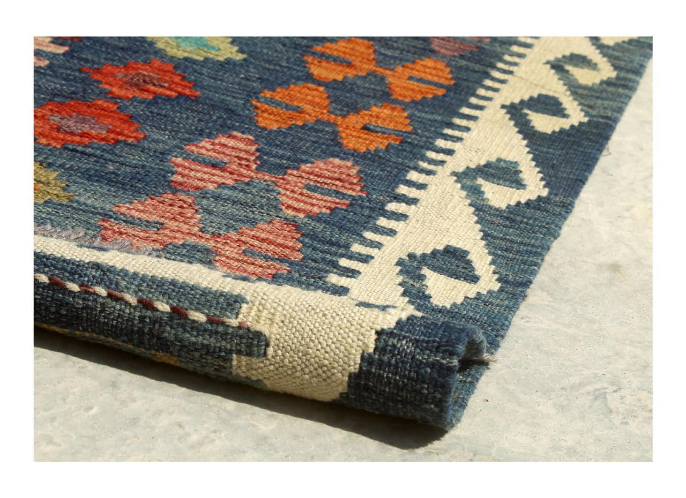 These Kilim rugs have a significant difference from hand-knotted rugs—they are handwoven. As a result, they do not have a high pile of wool and are often flatter and rougher than knotted wool rugs. Their construction is less intricate, making them generally much more affordable. Additionally, Kilim rugs are much lighter and can be laid out on either side. Handwoven Kilims originally come from what was once Persia and are now also widely produced in Afghanistan. They typically feature simple, straight-line patterns, which are characteristic of their weaving technique.