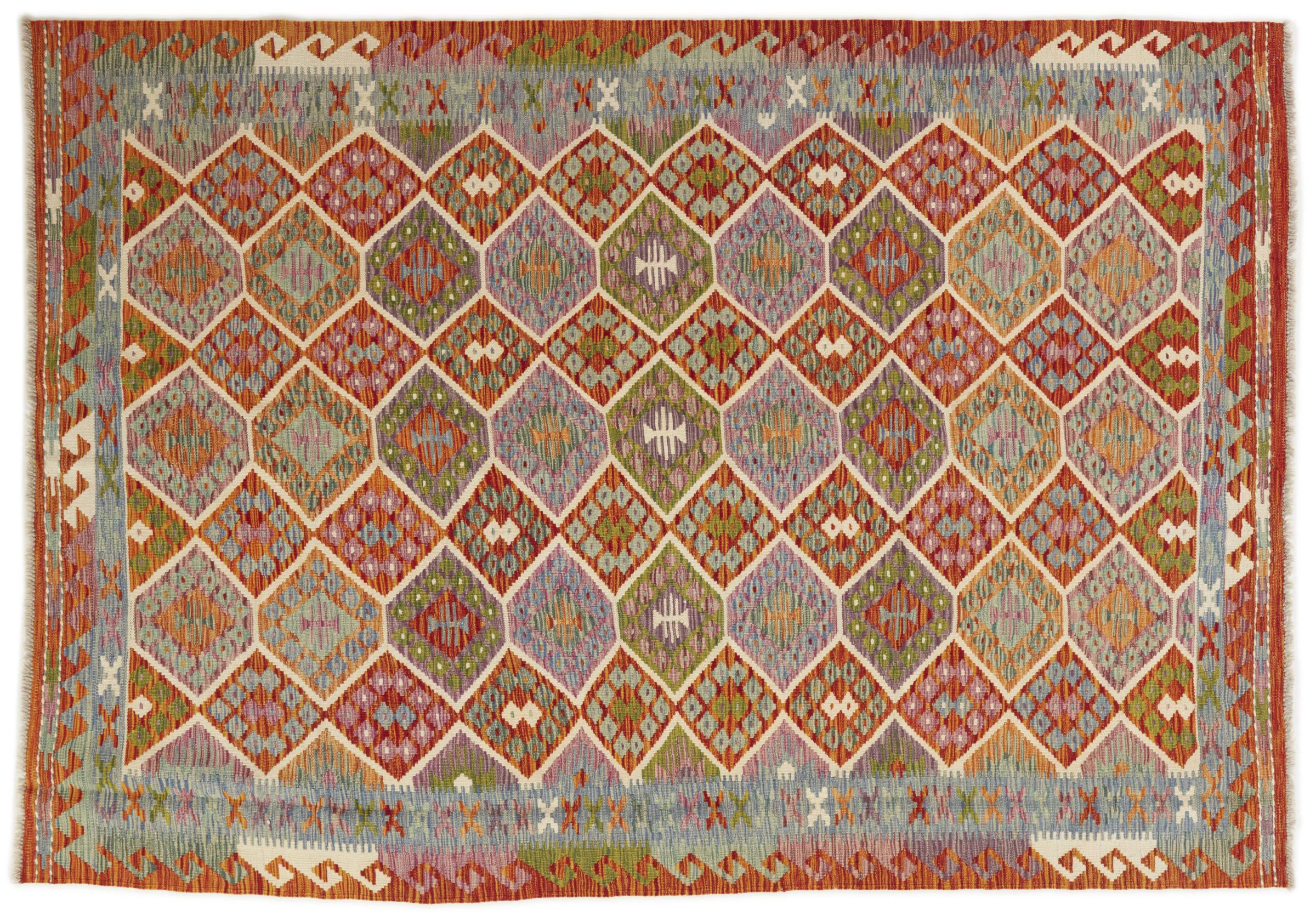 This Kilim Afghan rug has beautiful colors. It is handmade from fine wool. These patterns are traditional design elements that have already been used centuries ago. This particular kilim has been woven by hand in Afghanistan, a country with a long history in weaving and knotting rugs. The rug is robust and can be laid out on both sides.