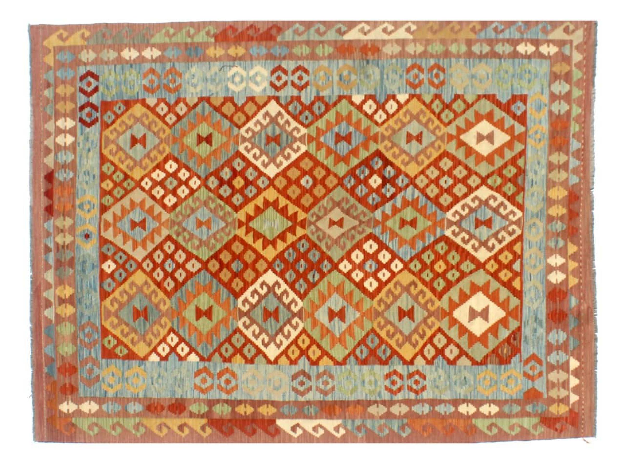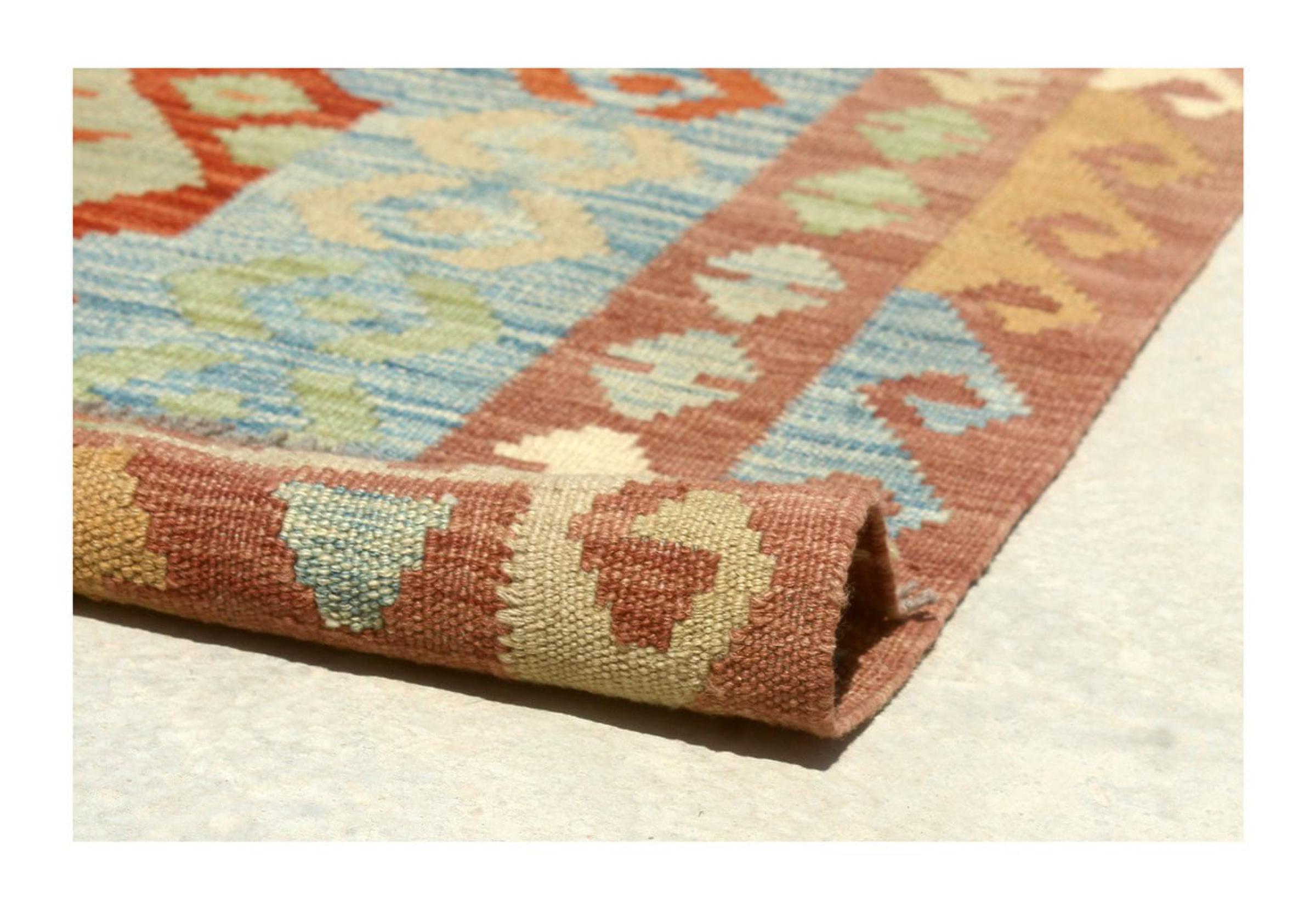 This Kilim Afghan rug has beautiful colors. It is handmade from fine wool. These patterns are traditional design elements that have already been used centuries ago. This particular kilim has been woven by hand in Afghanistan, a country with a long history in weaving and knotting rugs. The rug is robust and can be laid out on both sides.