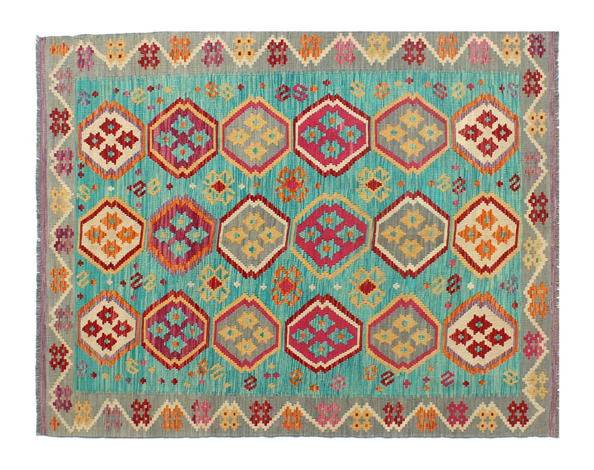 This Kilim Afghan rug has beautiful colors. It is handmade from fine wool. These patterns are traditional design elements that have already been used centuries ago. This particular kilim has been woven by hand in Afghanistan, a country with a long history in weaving and knotting rugs. The rug is robust and can be laid out on both sides.