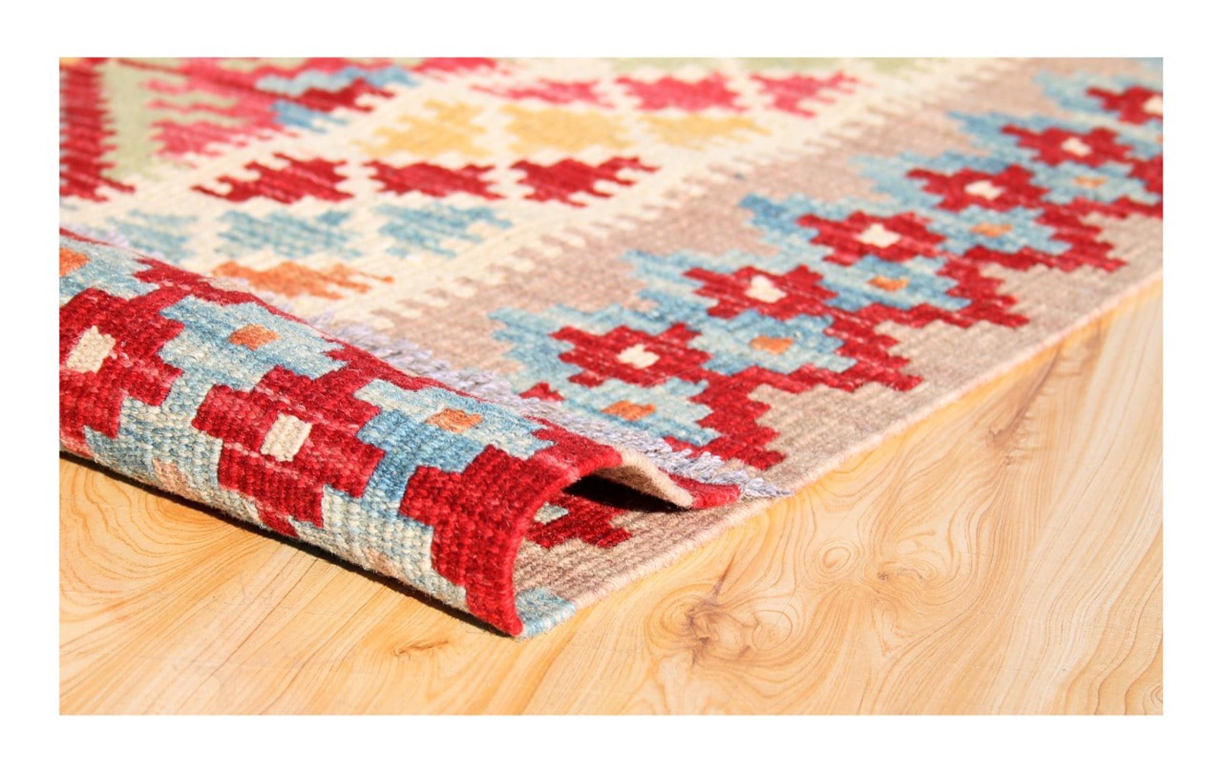 These Kilim rugs have a significant difference from hand-knotted rugs—they are handwoven. As a result, they do not have a high pile of wool and are often flatter and rougher than knotted wool rugs. Their construction is less intricate, making them generally much more affordable. Additionally, Kilim rugs are much lighter and can be laid out on either side. Handwoven Kilims originally come from what was once Persia and are now also widely produced in Afghanistan. They typically feature simple, straight-line patterns, which are characteristic of their weaving technique.