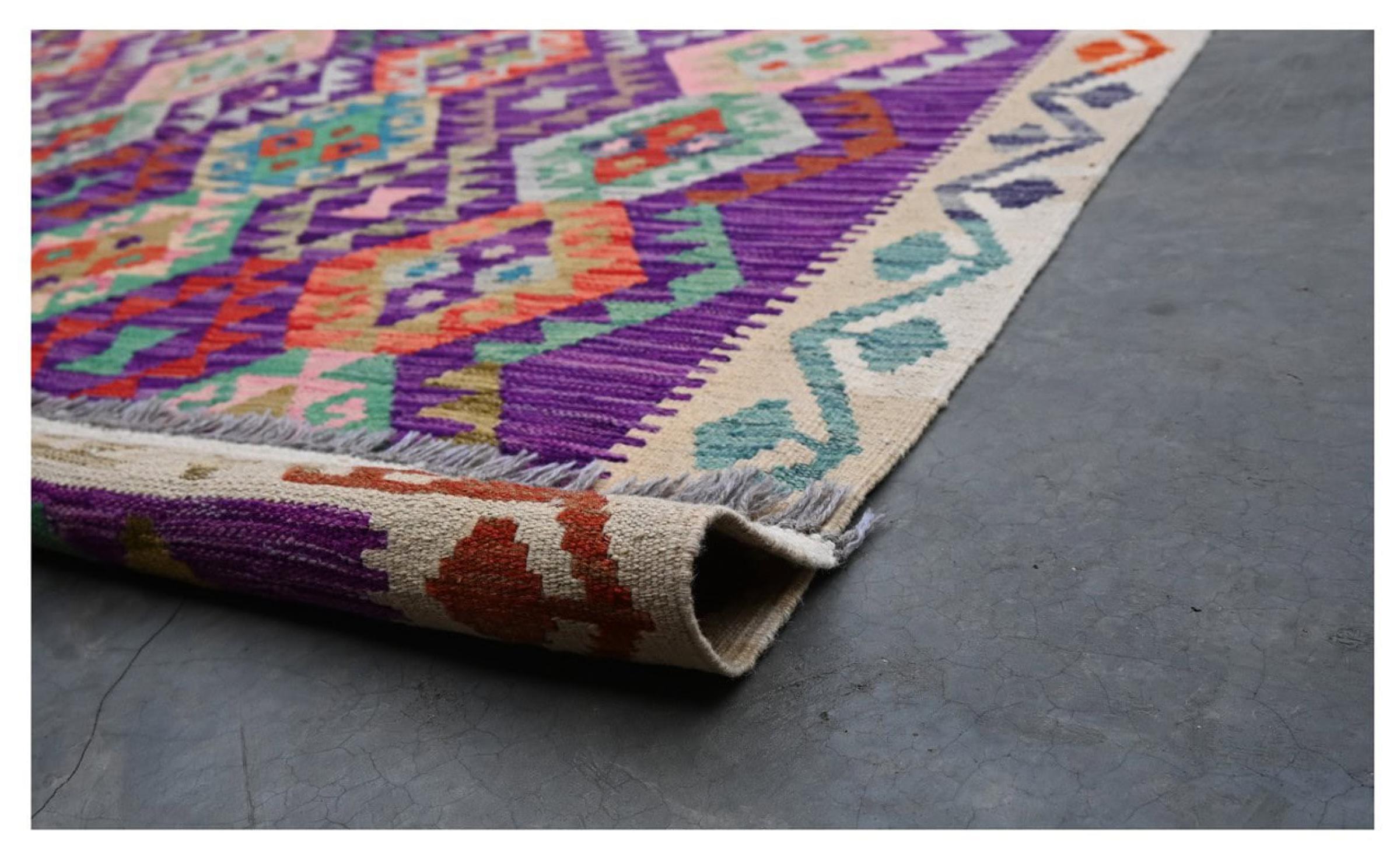 These Kilim rugs have a significant difference from hand-knotted rugs—they are handwoven. As a result, they do not have a high pile of wool and are often flatter and rougher than knotted wool rugs. Their construction is less intricate, making them generally much more affordable. Additionally, Kilim rugs are much lighter and can be laid out on either side. Handwoven Kilims originally come from what was once Persia and are now also widely produced in Afghanistan. They typically feature simple, straight-line patterns, which are characteristic of their weaving technique.