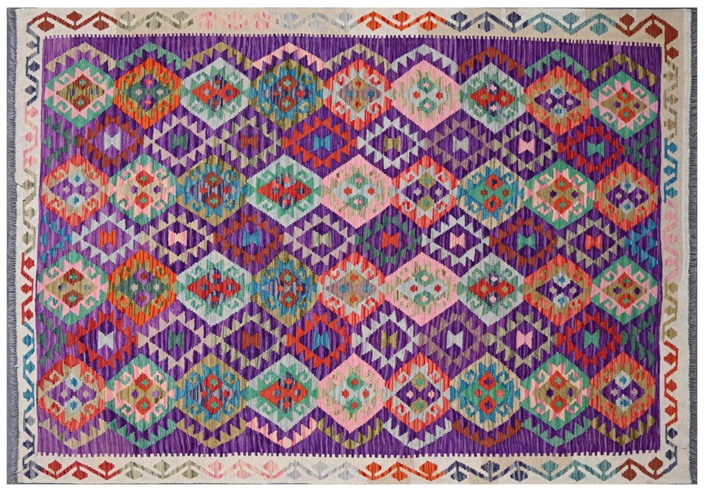 This Kilim Afghan rug has beautiful colors. It is handmade from fine wool. These patterns are traditional design elements that have already been used centuries ago. This particular kilim has been woven by hand in Afghanistan, a country with a long history in weaving and knotting rugs. The rug is robust and can be laid out on both sides.