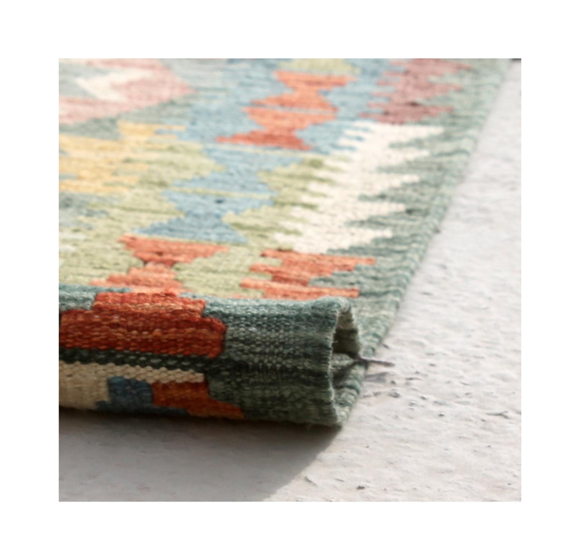 This Kilim Afghan rug has beautiful colors. It is handmade from fine wool. These patterns are traditional design elements that have already been used centuries ago. This particular kilim has been woven by hand in Afghanistan, a country with a long history in weaving and knotting rugs. The rug is robust and can be laid out on both sides.