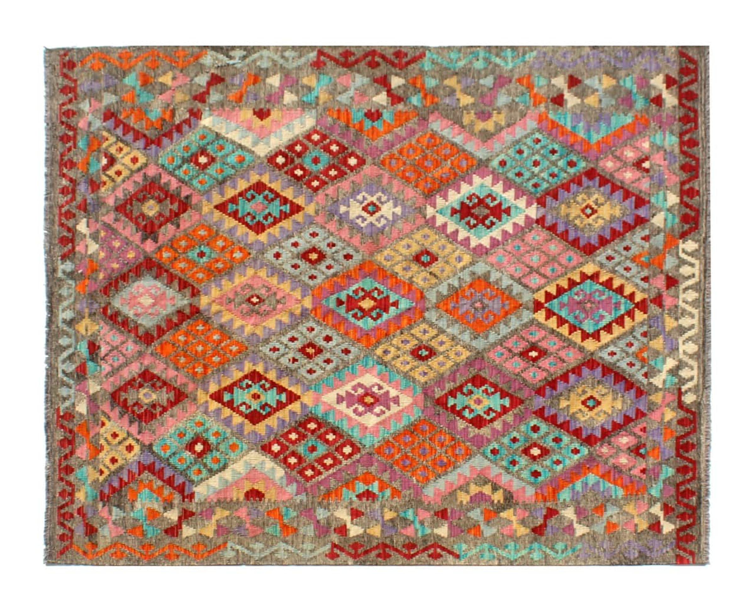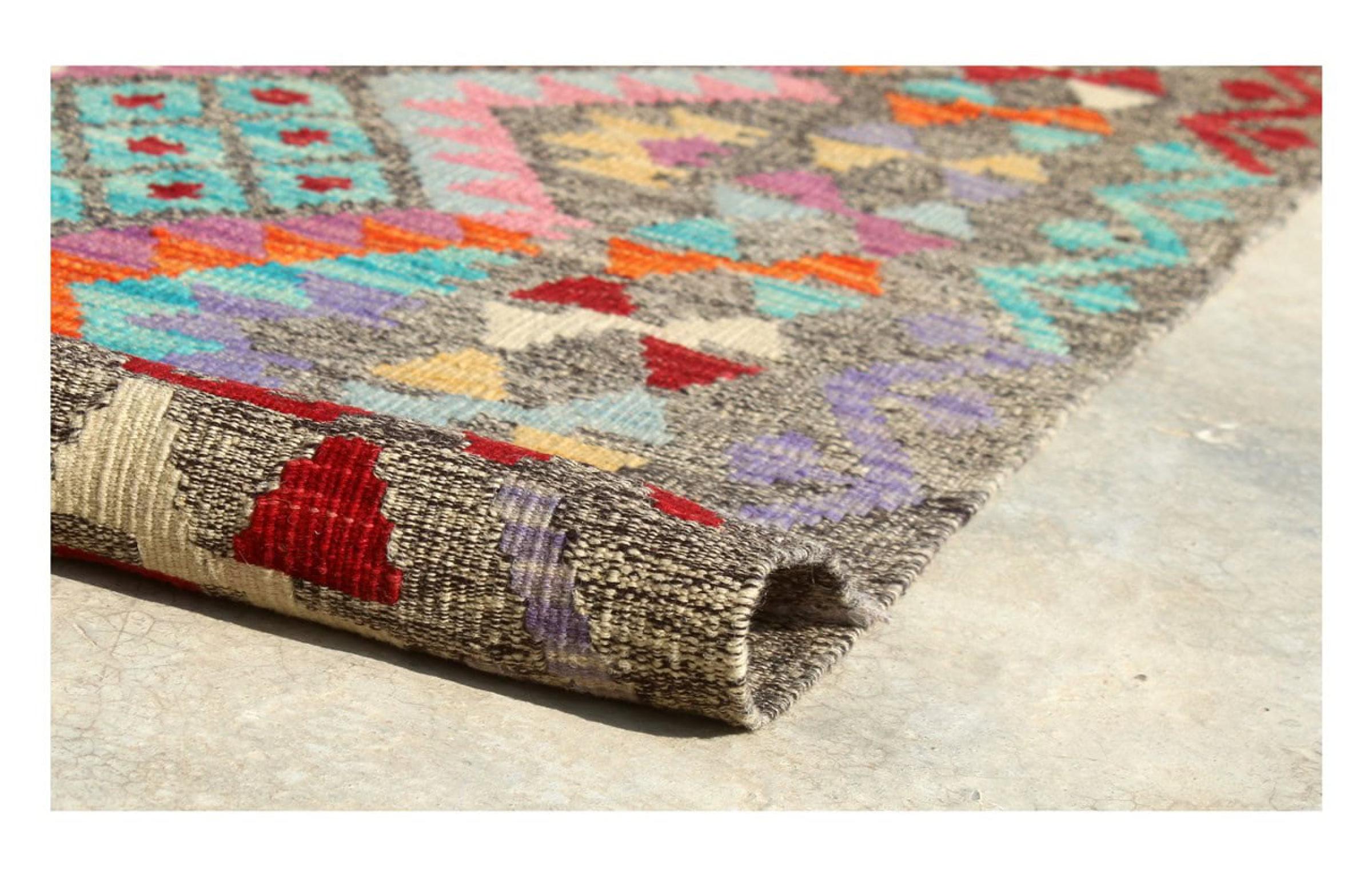 This Kilim Afghan rug has beautiful colors. It is handmade from fine wool. These patterns are traditional design elements that have already been used centuries ago. This particular kilim has been woven by hand in Afghanistan, a country with a long history in weaving and knotting rugs. The rug is robust and can be laid out on both sides.