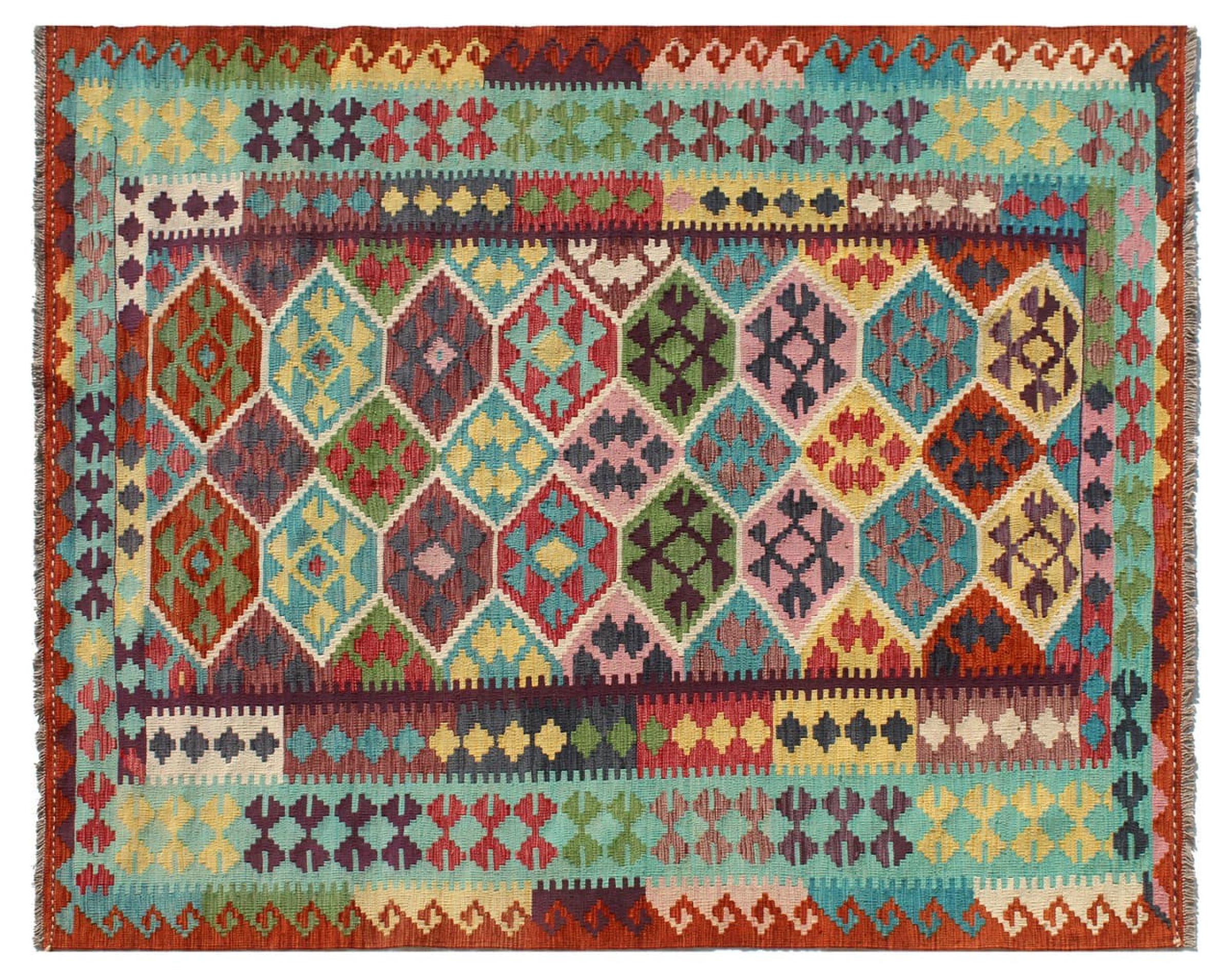 This Kilim Afghan rug has beautiful colors. It is handmade from fine wool. These patterns are traditional design elements that have already been used centuries ago. This particular kilim has been woven by hand in Afghanistan, a country with a long history in weaving and knotting rugs. The rug is robust and can be laid out on both sides.
