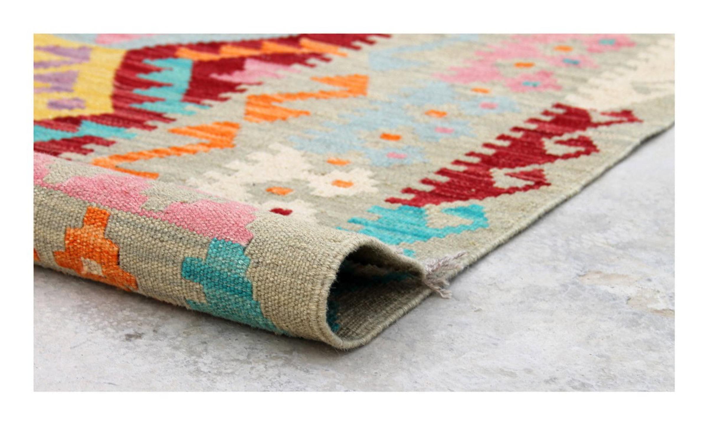 This Kilim Afghan rug has beautiful colors. It is handmade from fine wool. These patterns are traditional design elements that have already been used centuries ago. This particular kilim has been woven by hand in Afghanistan, a country with a long history in weaving and knotting rugs. The rug is robust and can be laid out on both sides.