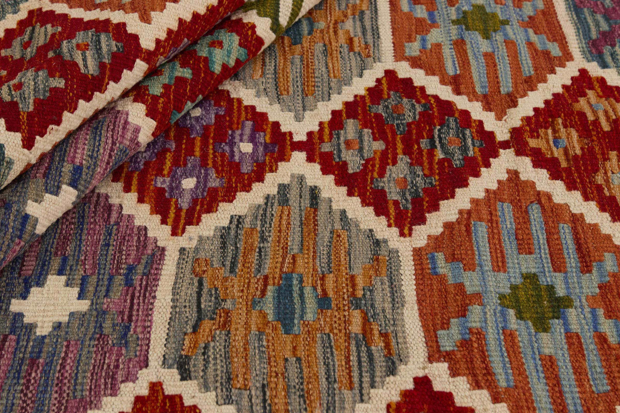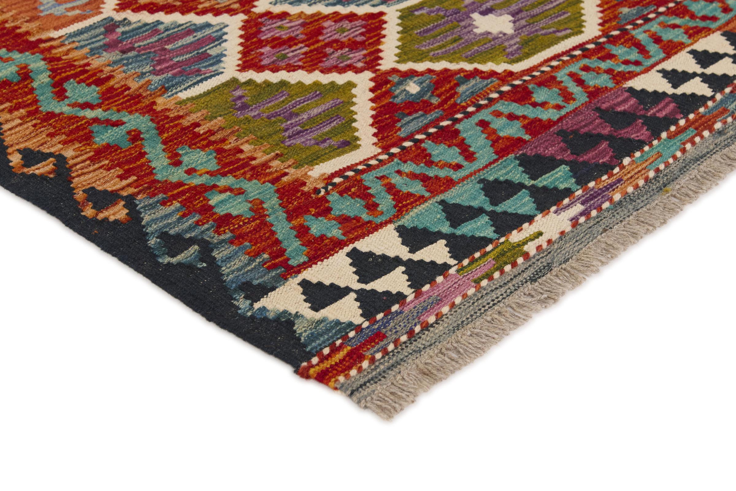 This Kilim Afghan rug has beautiful colors. It is handmade from fine wool. These patterns are traditional design elements that have already been used centuries ago. This particular kilim has been woven by hand in Afghanistan, a country with a long history in weaving and knotting rugs. The rug is robust and can be laid out on both sides.
