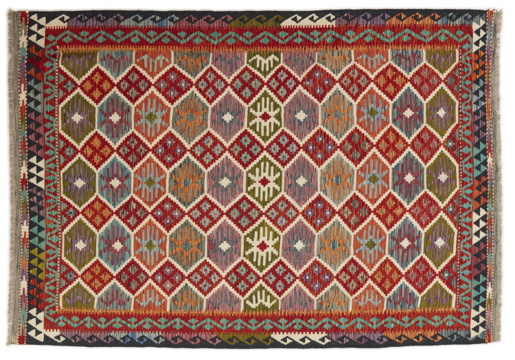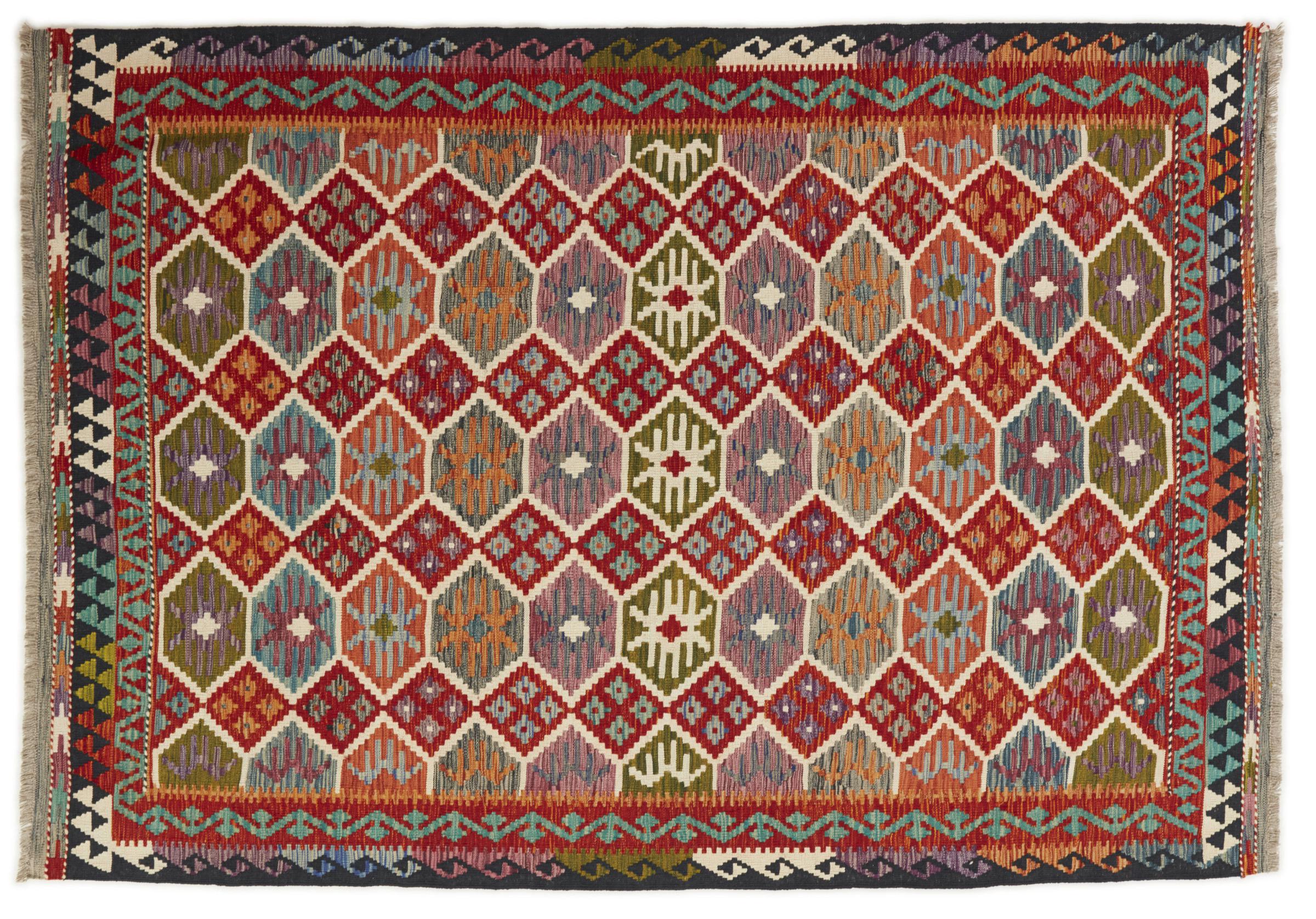 These Kilim rugs have a significant difference from hand-knotted rugs—they are handwoven. As a result, they do not have a high pile of wool and are often flatter and rougher than knotted wool rugs. Their construction is less intricate, making them generally much more affordable. Additionally, Kilim rugs are much lighter and can be laid out on either side. Handwoven Kilims originally come from what was once Persia and are now also widely produced in Afghanistan. They typically feature simple, straight-line patterns, which are characteristic of their weaving technique.