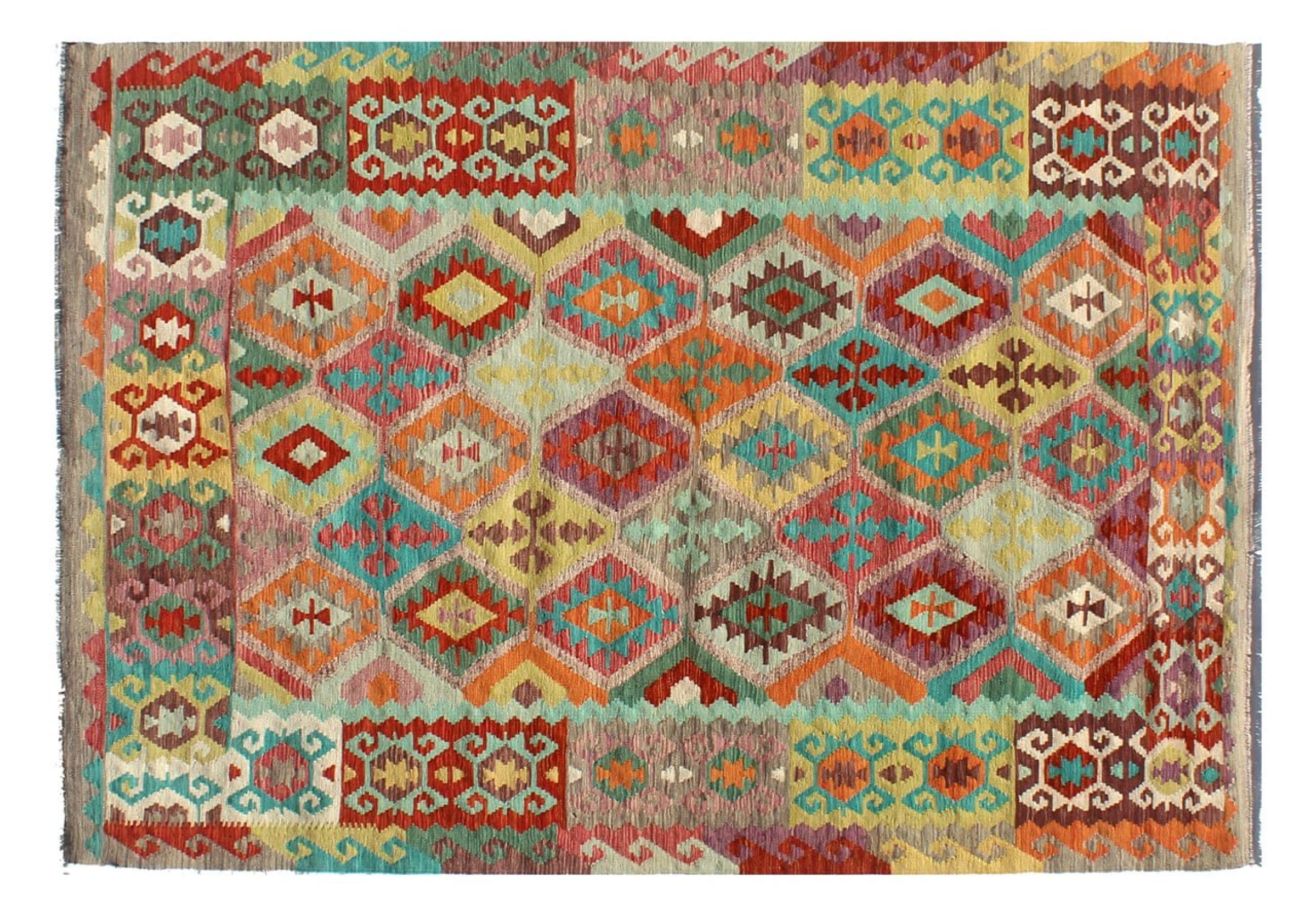 This Kilim Afghan rug has beautiful colors. It is handmade from fine wool. These patterns are traditional design elements that have already been used centuries ago. This particular kilim has been woven by hand in Afghanistan, a country with a long history in weaving and knotting rugs. The rug is robust and can be laid out on both sides.