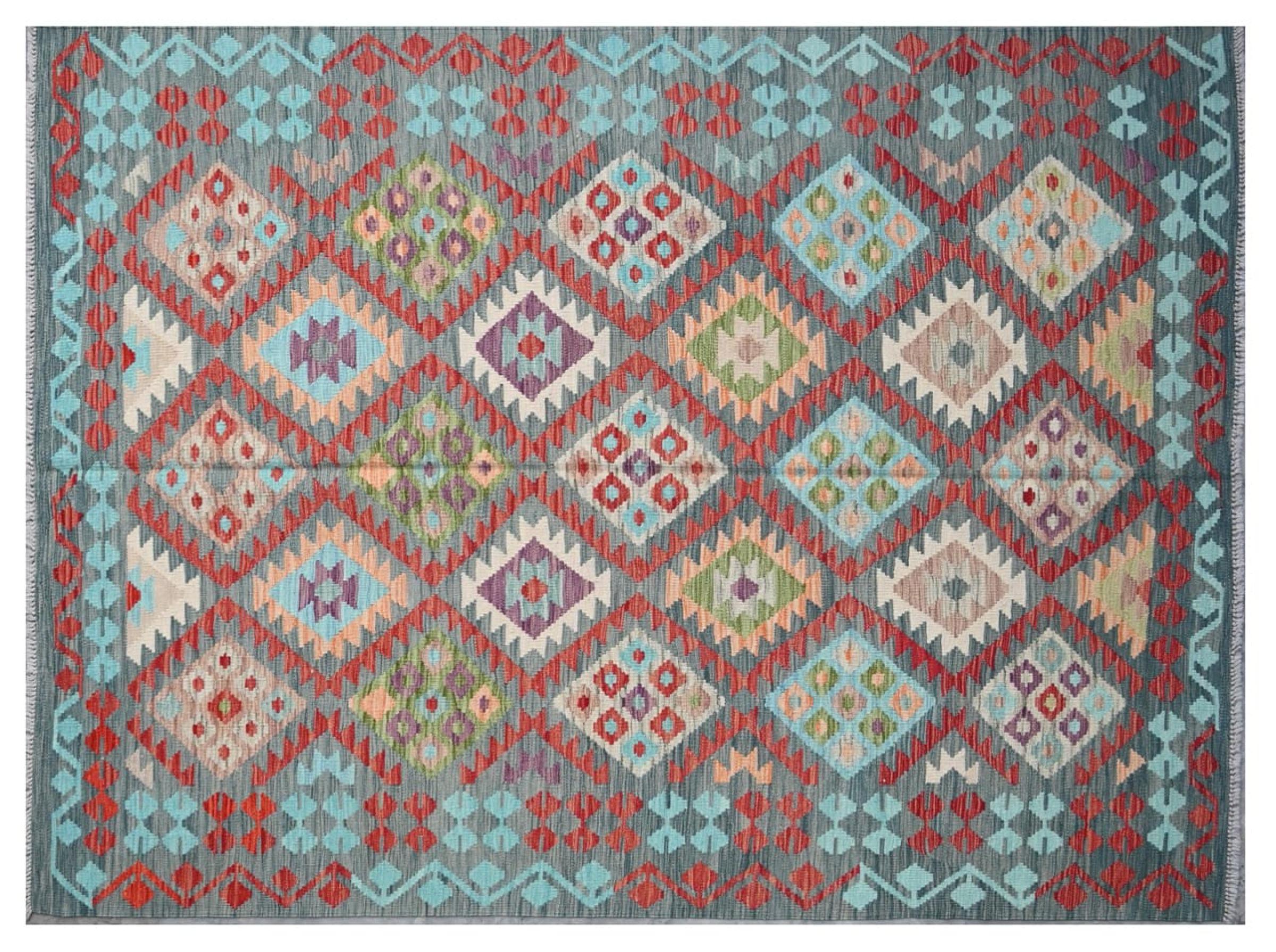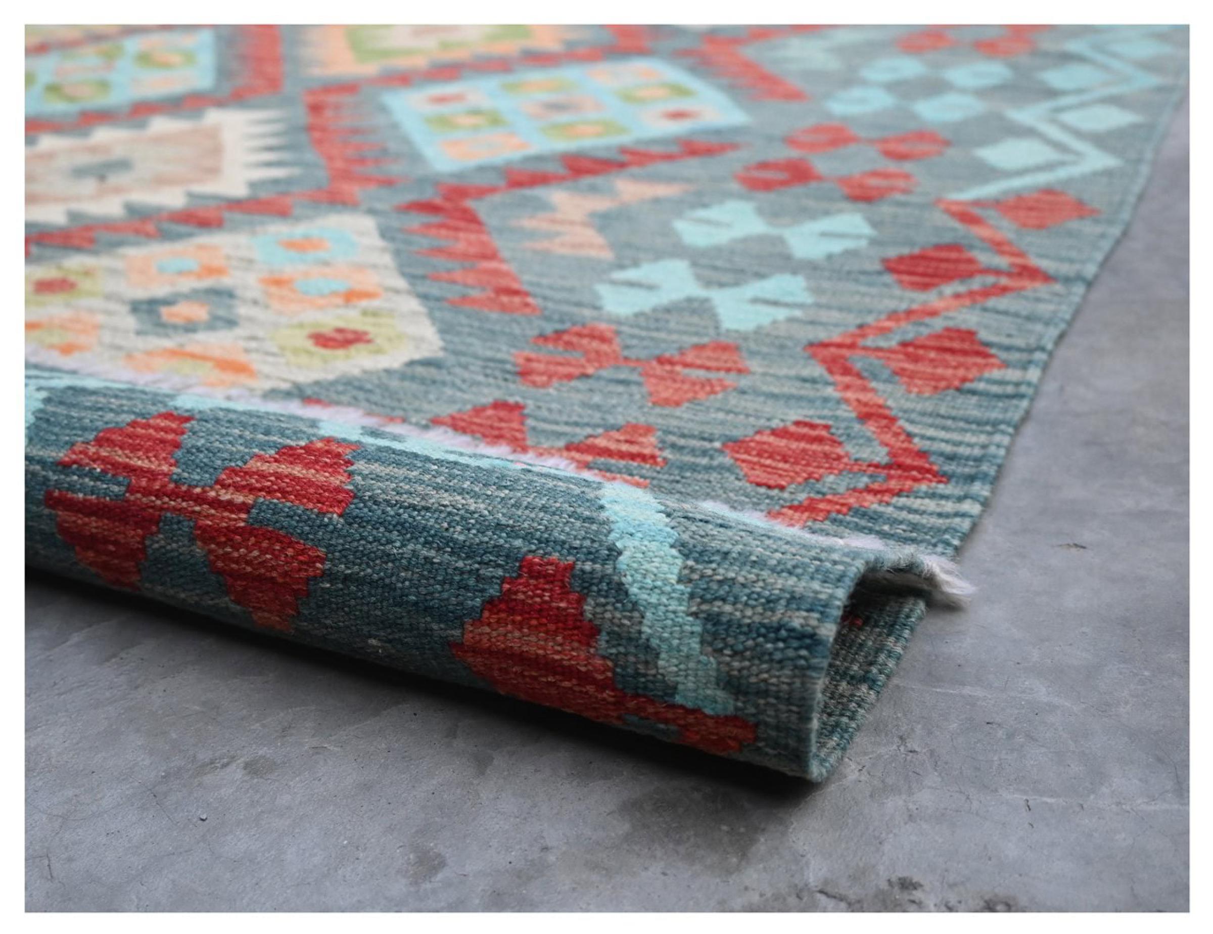 This Kilim Afghan rug has beautiful colors. It is handmade from fine wool. These patterns are traditional design elements that have already been used centuries ago. This particular kilim has been woven by hand in Afghanistan, a country with a long history in weaving and knotting rugs. The rug is robust and can be laid out on both sides.