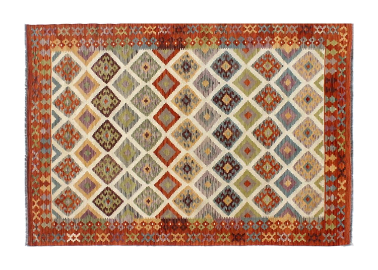 These Kilim rugs have a significant difference from hand-knotted rugs—they are handwoven. As a result, they do not have a high pile of wool and are often flatter and rougher than knotted wool rugs. Their construction is less intricate, making them generally much more affordable. Additionally, Kilim rugs are much lighter and can be laid out on either side. Handwoven Kilims originally come from what was once Persia and are now also widely produced in Afghanistan. They typically feature simple, straight-line patterns, which are characteristic of their weaving technique.