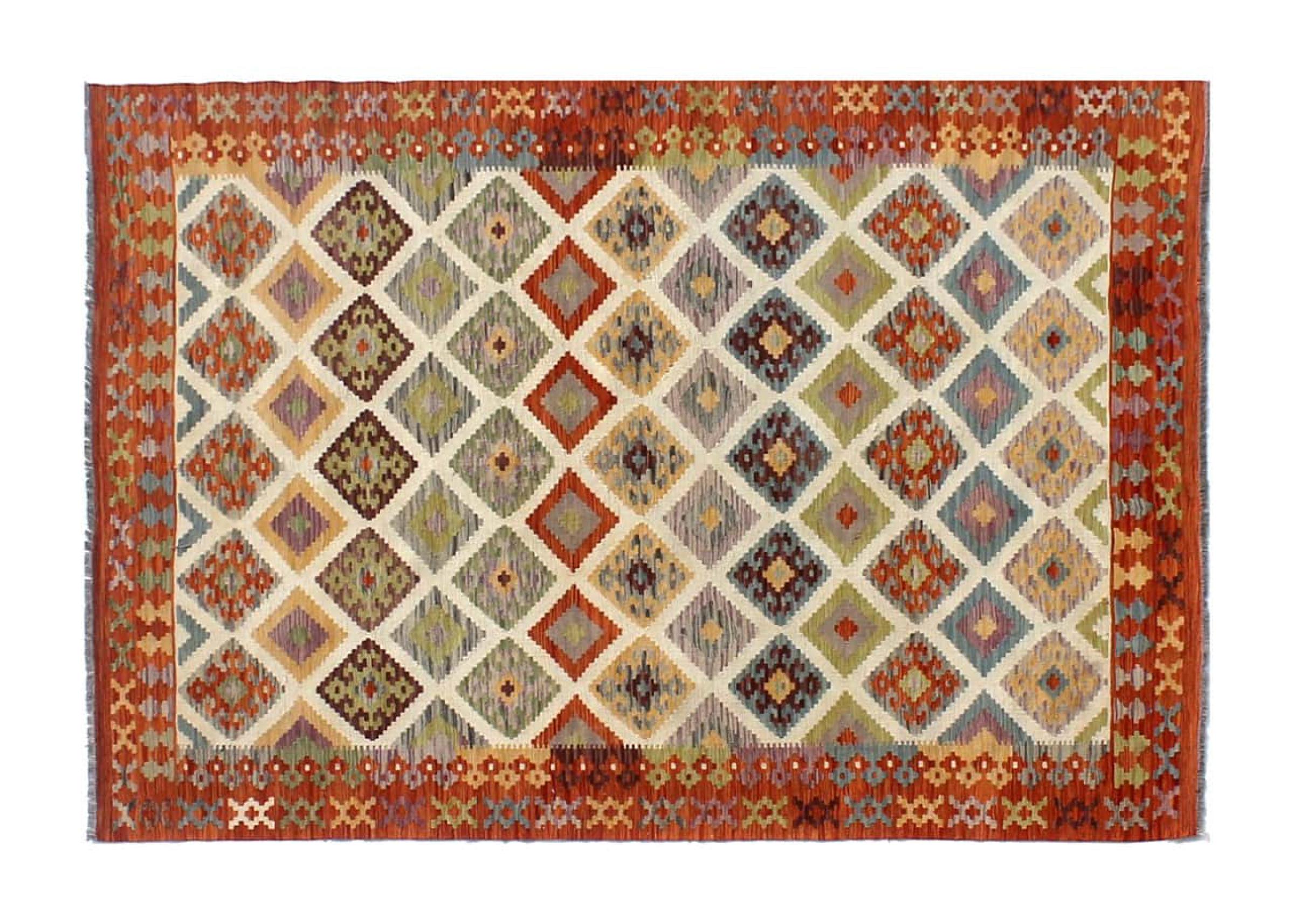 This Kilim Afghan rug has beautiful colors. It is handmade from fine wool. These patterns are traditional design elements that have already been used centuries ago. This particular kilim has been woven by hand in Afghanistan, a country with a long history in weaving and knotting rugs. The rug is robust and can be laid out on both sides.