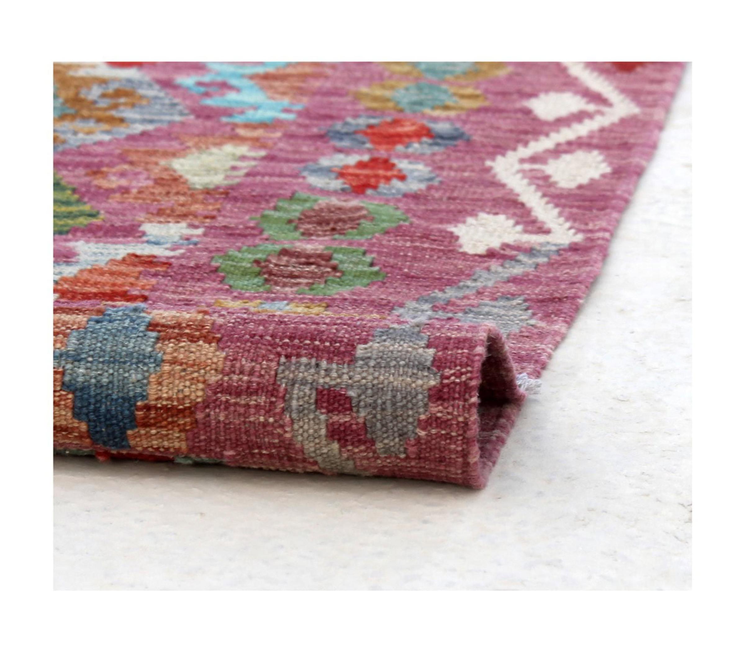This Kilim Afghan rug has beautiful colors. It is handmade from fine wool. These patterns are traditional design elements that have already been used centuries ago. This particular kilim has been woven by hand in Afghanistan, a country with a long history in weaving and knotting rugs. The rug is robust and can be laid out on both sides.