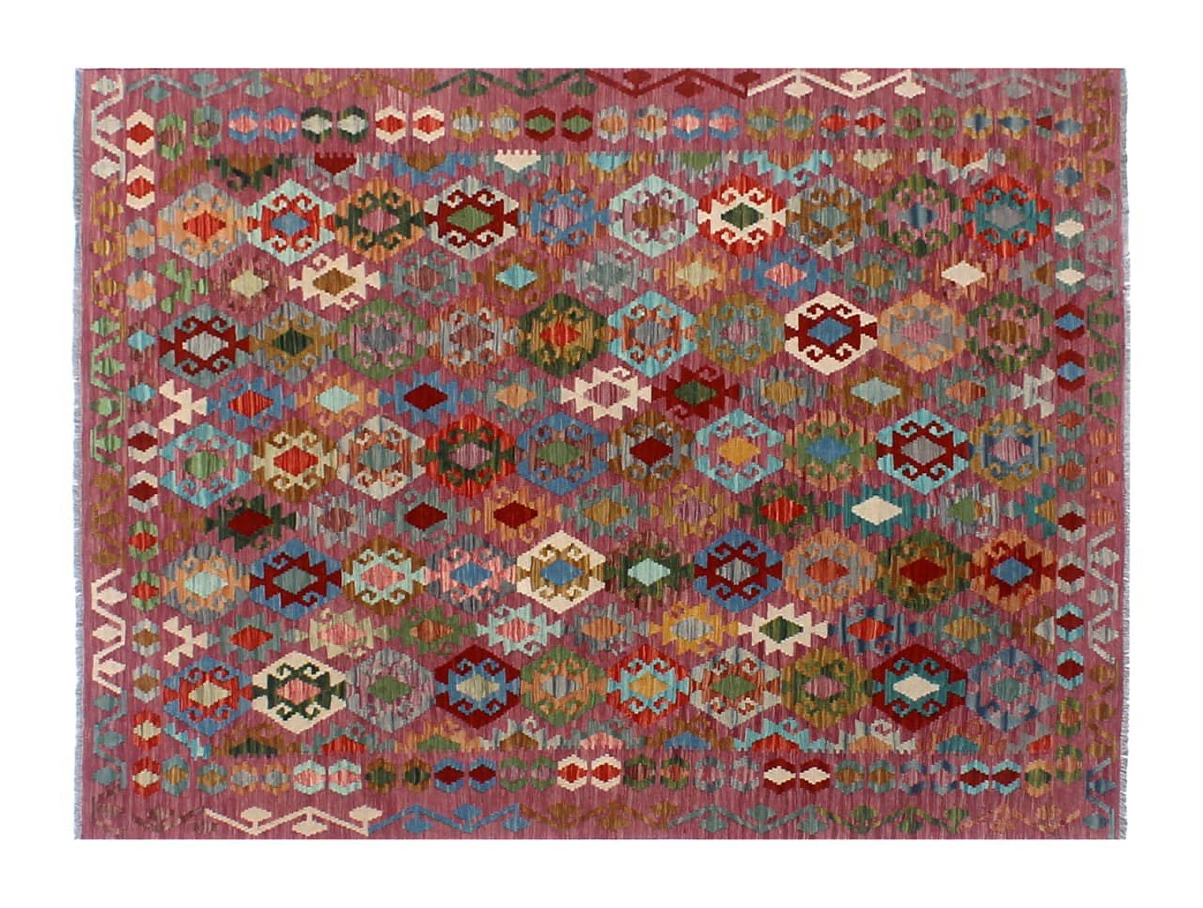 These Kilim rugs have a significant difference from hand-knotted rugs—they are handwoven. As a result, they do not have a high pile of wool and are often flatter and rougher than knotted wool rugs. Their construction is less intricate, making them generally much more affordable. Additionally, Kilim rugs are much lighter and can be laid out on either side. Handwoven Kilims originally come from what was once Persia and are now also widely produced in Afghanistan. They typically feature simple, straight-line patterns, which are characteristic of their weaving technique.
