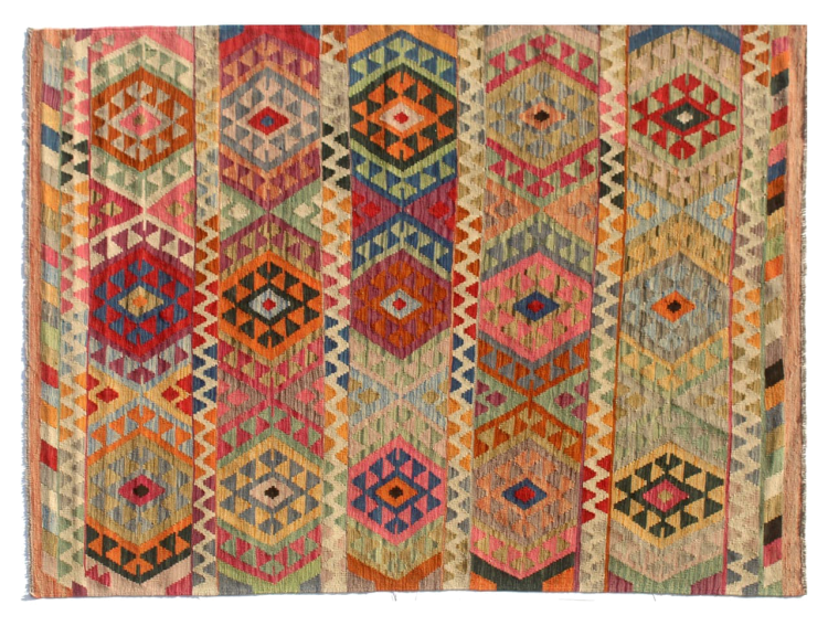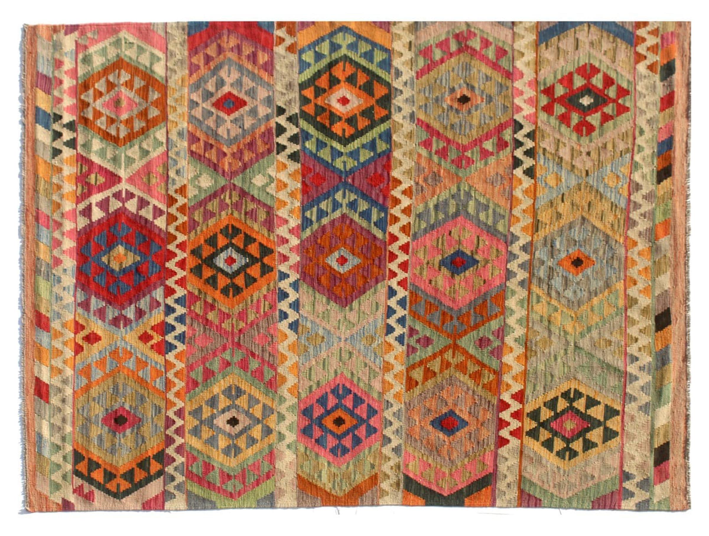 These Kilim rugs have a significant difference from hand-knotted rugs—they are handwoven. As a result, they do not have a high pile of wool and are often flatter and rougher than knotted wool rugs. Their construction is less intricate, making them generally much more affordable. Additionally, Kilim rugs are much lighter and can be laid out on either side. Handwoven Kilims originally come from what was once Persia and are now also widely produced in Afghanistan. They typically feature simple, straight-line patterns, which are characteristic of their weaving technique.