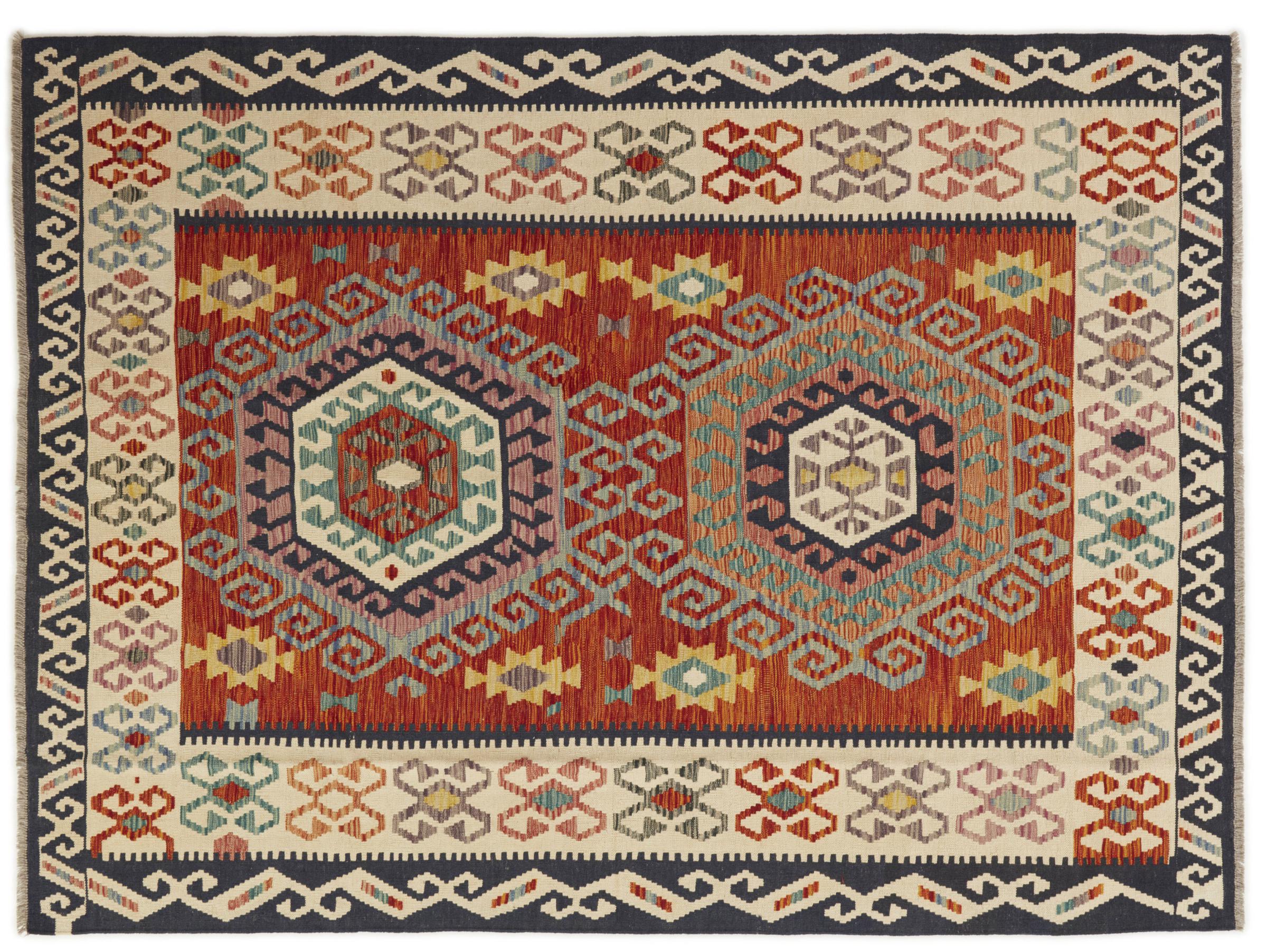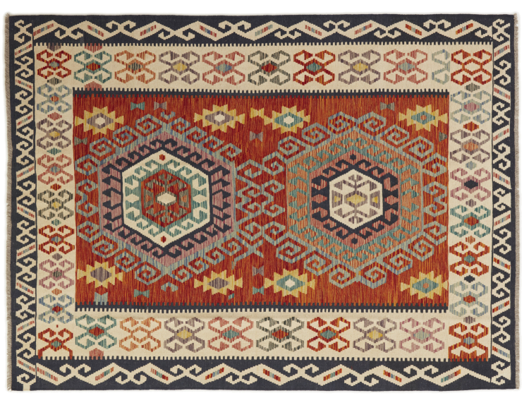 These Kilim rugs have a significant difference from hand-knotted rugs—they are handwoven. As a result, they do not have a high pile of wool and are often flatter and rougher than knotted wool rugs. Their construction is less intricate, making them generally much more affordable. Additionally, Kilim rugs are much lighter and can be laid out on either side. Handwoven Kilims originally come from what was once Persia and are now also widely produced in Afghanistan. They typically feature simple, straight-line patterns, which are characteristic of their weaving technique.