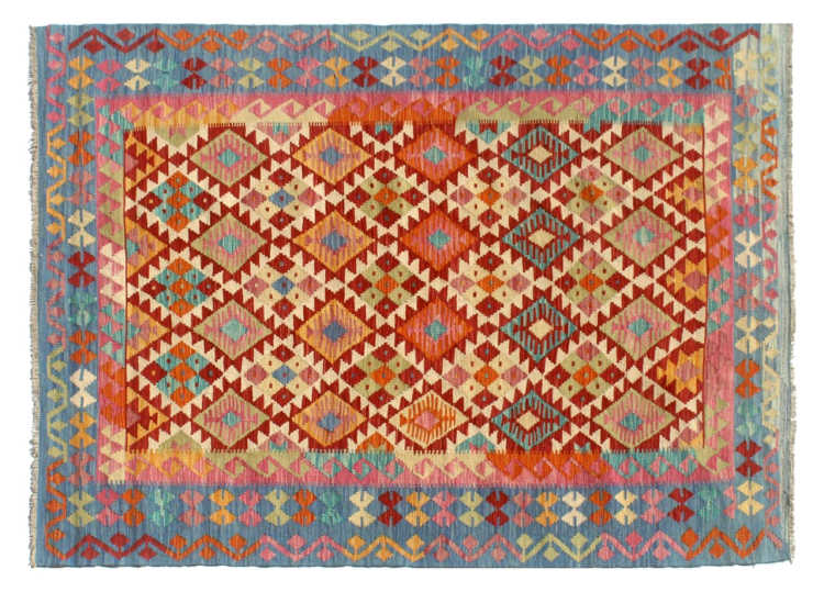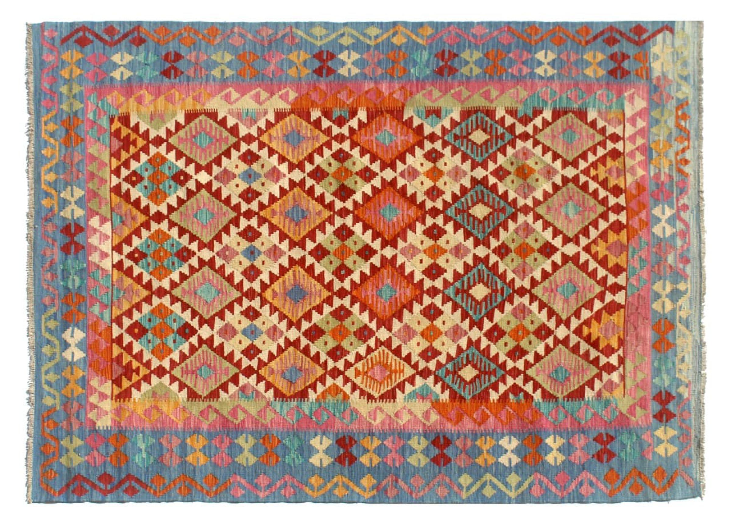 These Kilim rugs have a significant difference from hand-knotted rugs—they are handwoven. As a result, they do not have a high pile of wool and are often flatter and rougher than knotted wool rugs. Their construction is less intricate, making them generally much more affordable. Additionally, Kilim rugs are much lighter and can be laid out on either side. Handwoven Kilims originally come from what was once Persia and are now also widely produced in Afghanistan. They typically feature simple, straight-line patterns, which are characteristic of their weaving technique.