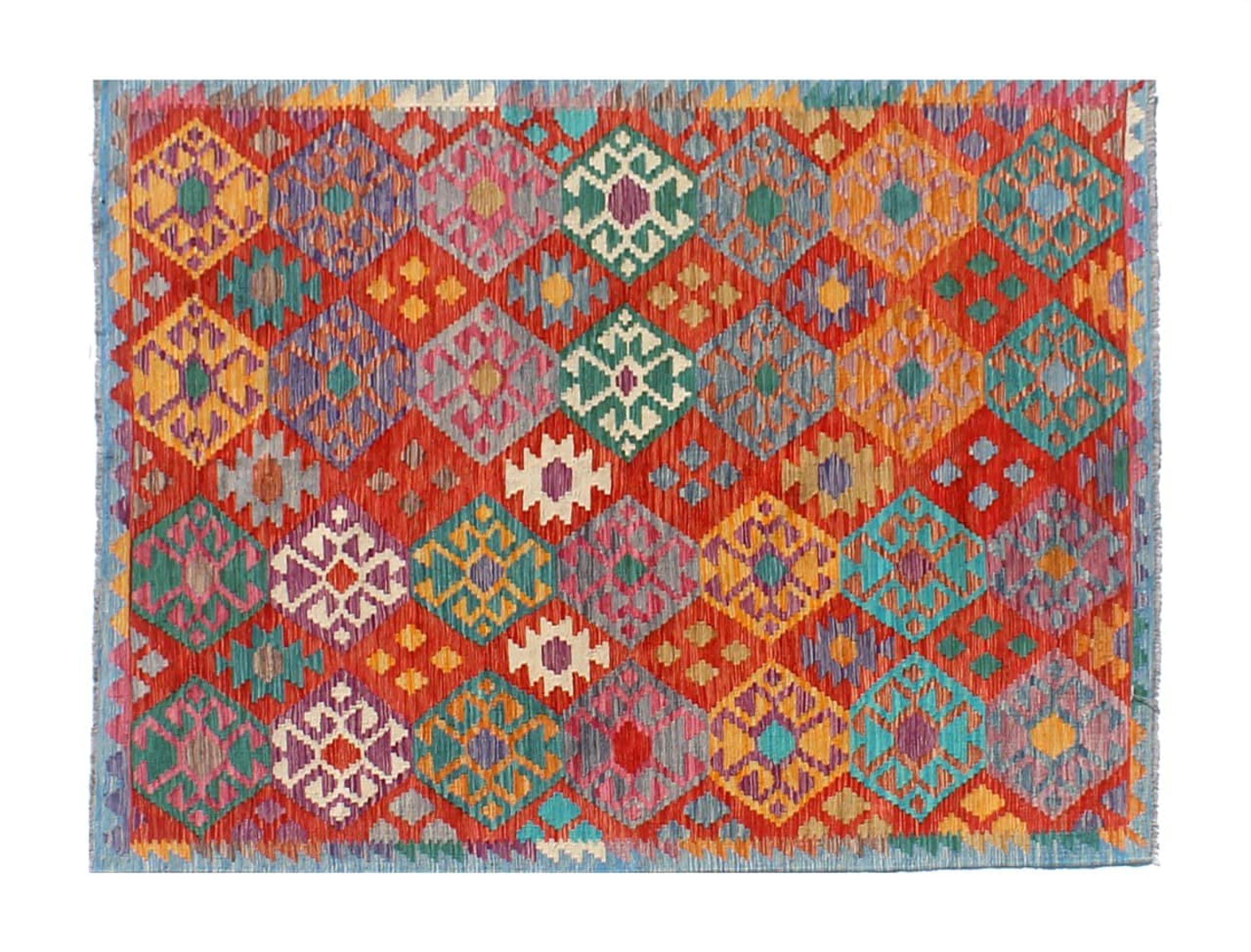 This Kilim Afghan rug has beautiful colors. It is handmade from fine wool. These patterns are traditional design elements that have already been used centuries ago. This particular kilim has been woven by hand in Afghanistan, a country with a long history in weaving and knotting rugs. The rug is robust and can be laid out on both sides.