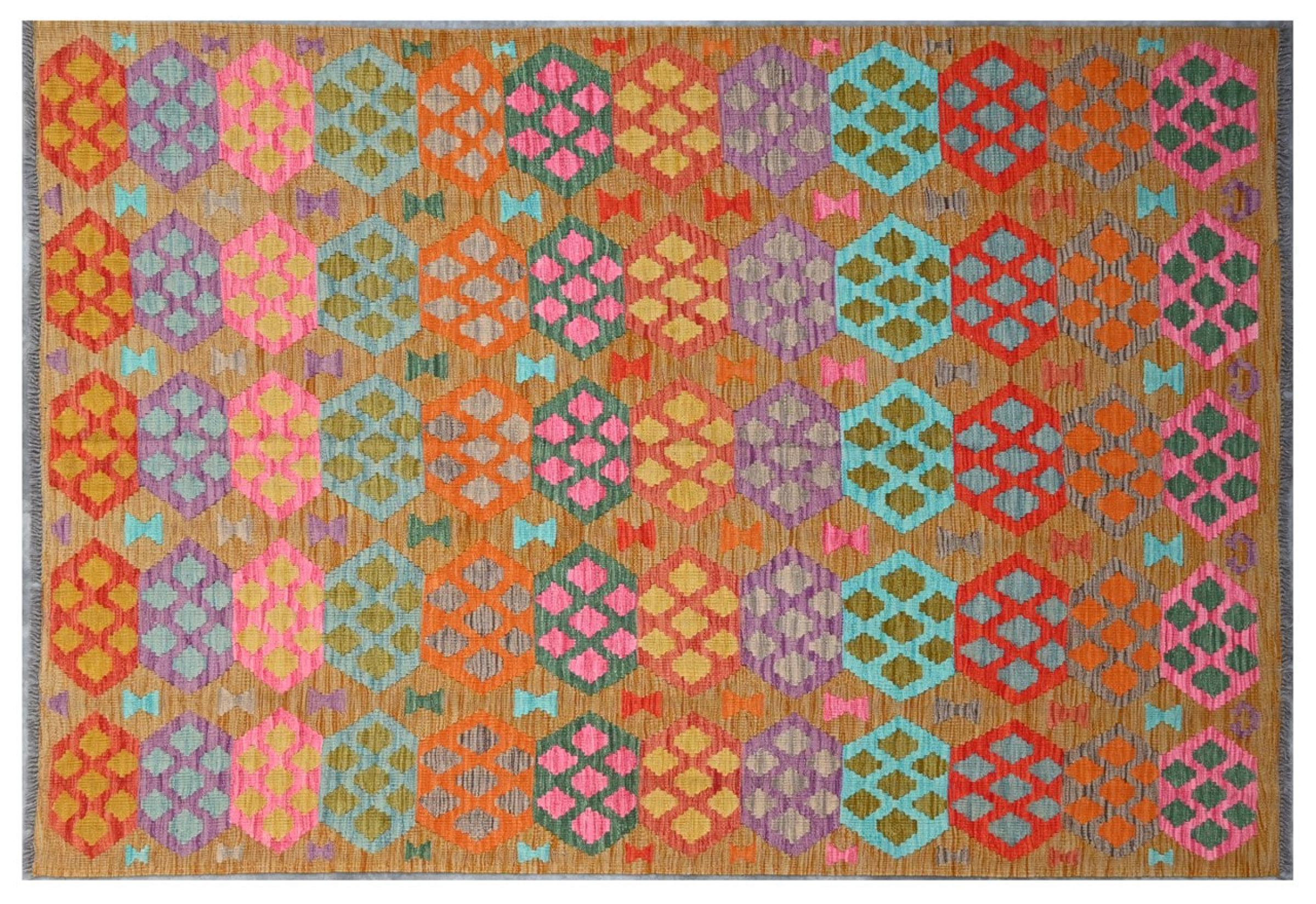This Kilim Afghan rug has beautiful colors. It is handmade from fine wool. These patterns are traditional design elements that have already been used centuries ago. This particular kilim has been woven by hand in Afghanistan, a country with a long history in weaving and knotting rugs. The rug is robust and can be laid out on both sides.