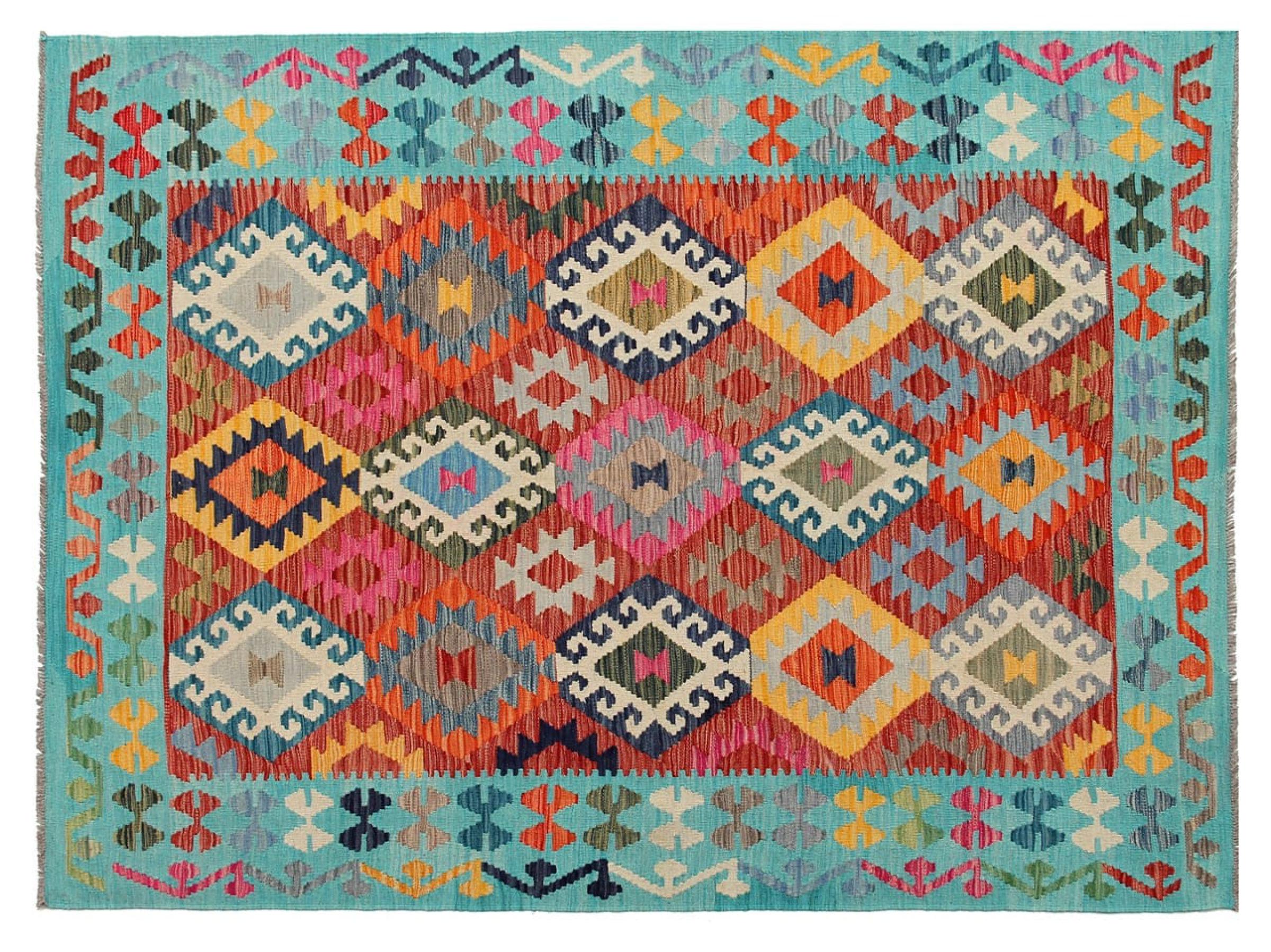 This Kilim Afghan rug has beautiful colors. It is handmade from fine wool. These patterns are traditional design elements that have already been used centuries ago. This particular kilim has been woven by hand in Afghanistan, a country with a long history in weaving and knotting rugs. The rug is robust and can be laid out on both sides.